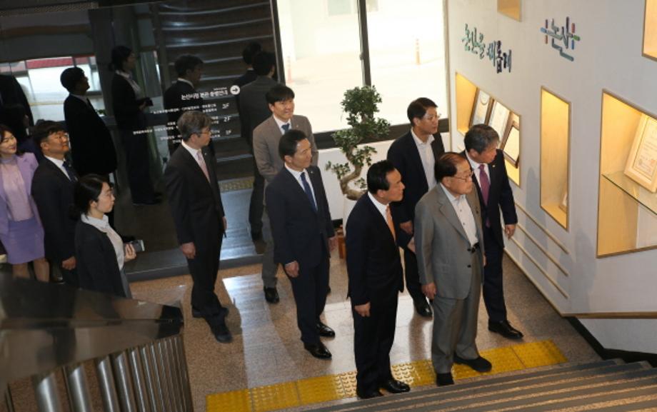 19일 오후 논산시청을 방문한 김희수 명예총장과 김용하 총장이 백성현 시장의 안내를 받아 시청을 둘러보는 모습.jpg