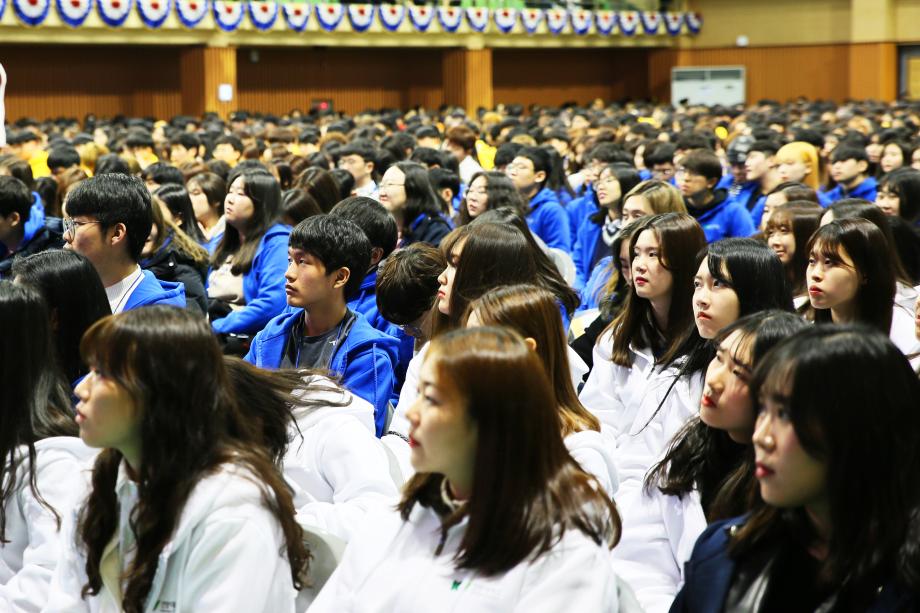 사진 2. 1. 26일 오후 논산 창의융합캠퍼스에서 열린 건양대 2018학도 입학식에 참가한 신입생들이 밝은 모습으로 단상을 바라보는 모습