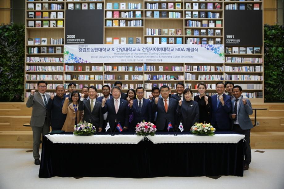건양대학교(총장 김용하)와 건양사이버대학교(총장 이동진), 캄보디아 왕립프놈펜대학교(RUPP)가 25일 오후 건양대 메디컬캠퍼스 건양역사관에서 3개 대학간 위성 캠퍼스 사무실 운영, 한국어 온라인 교육콘텐츠, 한국 대규모 공개 온라인 과정(K-MOOC) 협력을 주요 골자로 하는 내용의 MOA(Memorandum of Agreement) 체결식을 개최했다.
