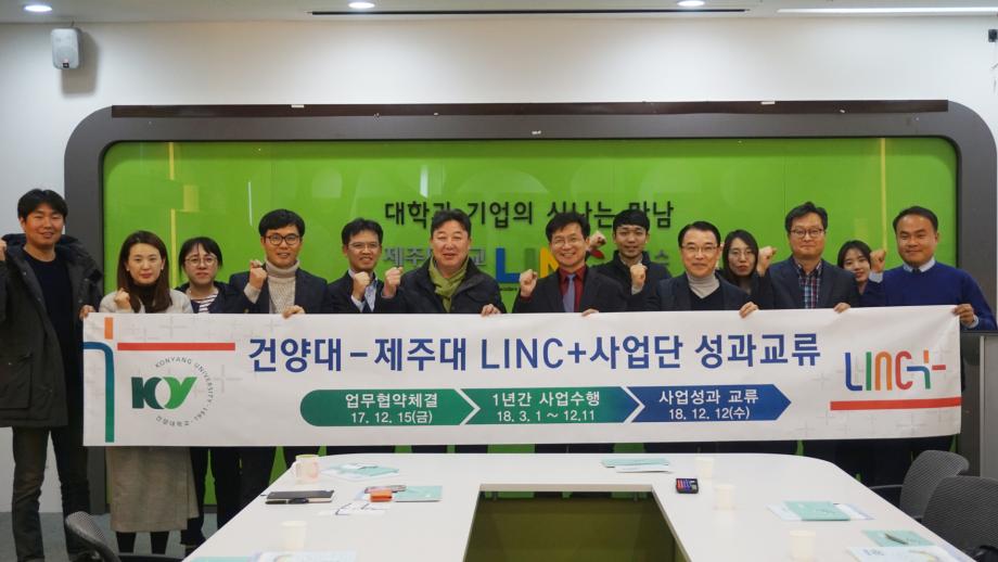 먼저 제주대학교 LINC+사업단(단장 강철웅)과 진행된 성과교류회는 건양대 산학협력단장 홍영기 교수, LINC+사업단장 김영일 교수, 창업지원단장 송영진 교수, LINC+사업팀장 강현식, 제주대학교 LINC+사업단장 강철웅 교수, 부단장 장명훈 교수, 박민희 실장 등이 참석한 가운데 2018학년도 주요성과를 발표하고 차년도 사업계획 수립시 연계프로그램 개발에 대해 논의했다.