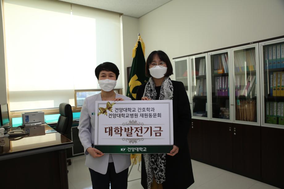 건양대학교(총장 이철성) 간호대학(학장 이미향)은 22일 오후 건양대 간호학과를 졸업하고 건양대학교병원에 근무하는 재원동문회(회장 정수정)로부터 발전기금 1130만원을 기탁받았다고 밝혔다. 이번에 기탁된 발전기금은 건양대학교병원 신관 내 마련된 간호학과 학습실 집기 및 학습 교보재 구입에 쓰일 예정이다. 또한 이날 건양대 일반대학원 간호학과 석사과정 졸업생인 강희정, 류경선, 권혜민 씨가 후배들을 위해 써달라며 100만원을 학과에 전달했다. 간호학과 재원 동문회는 지난 2017년 학과 후배들의 교육환경 개선과 각종 장학 혜택에 써달라며 4천만원의 발전기금을 전달한 바 있으며 매년 우수 졸업생에게 장학금을 전달하는 등 모교와 후배들에 대한 사랑을 실천하고 있다.