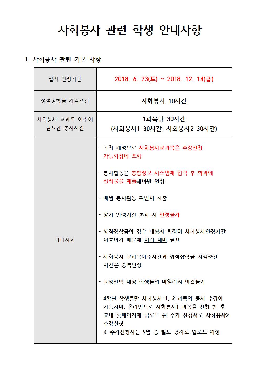 | 제목 | 2018학년도 2학기 사회봉사활동 및 사회봉사교과목 관련 안내 | ||||
