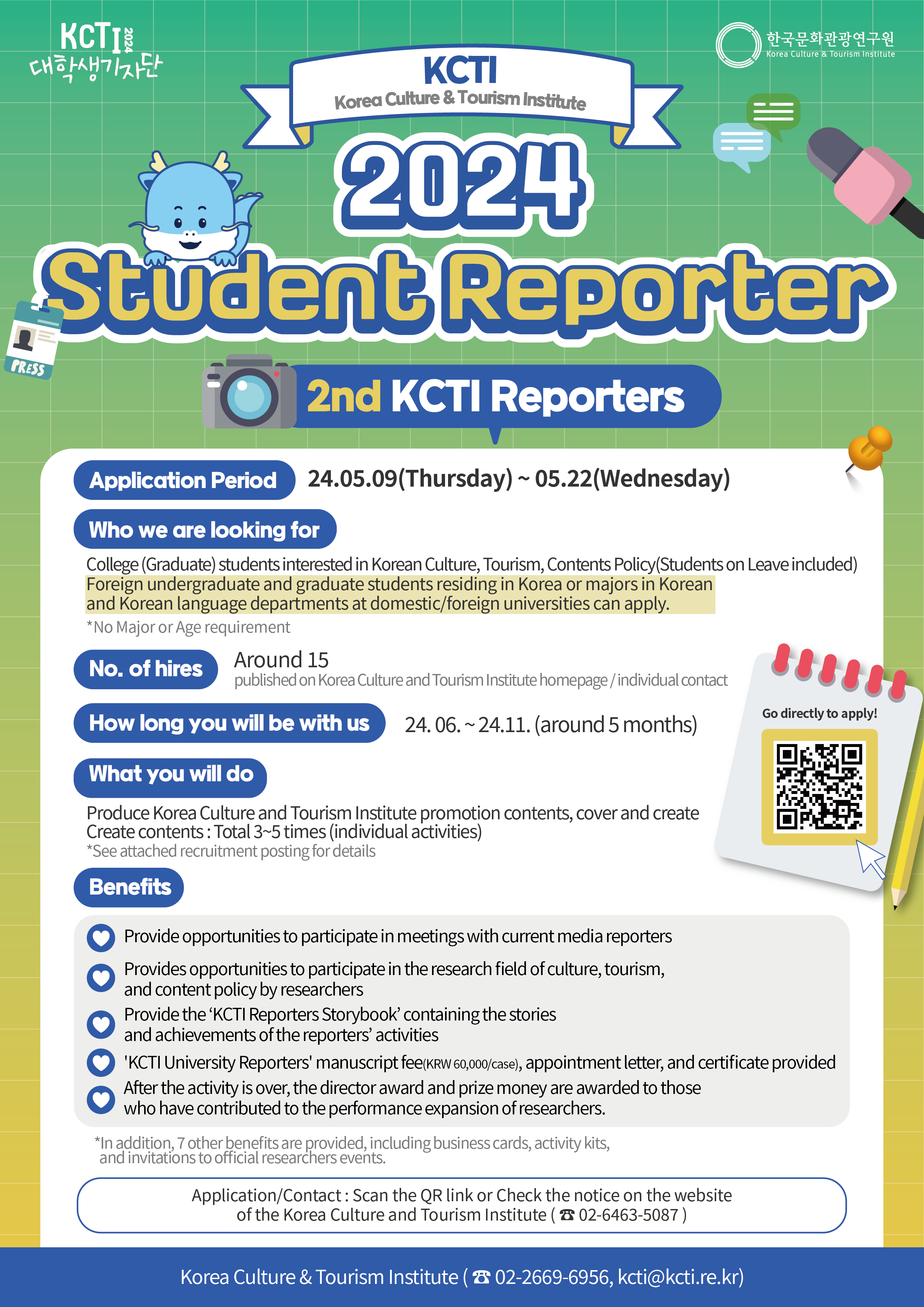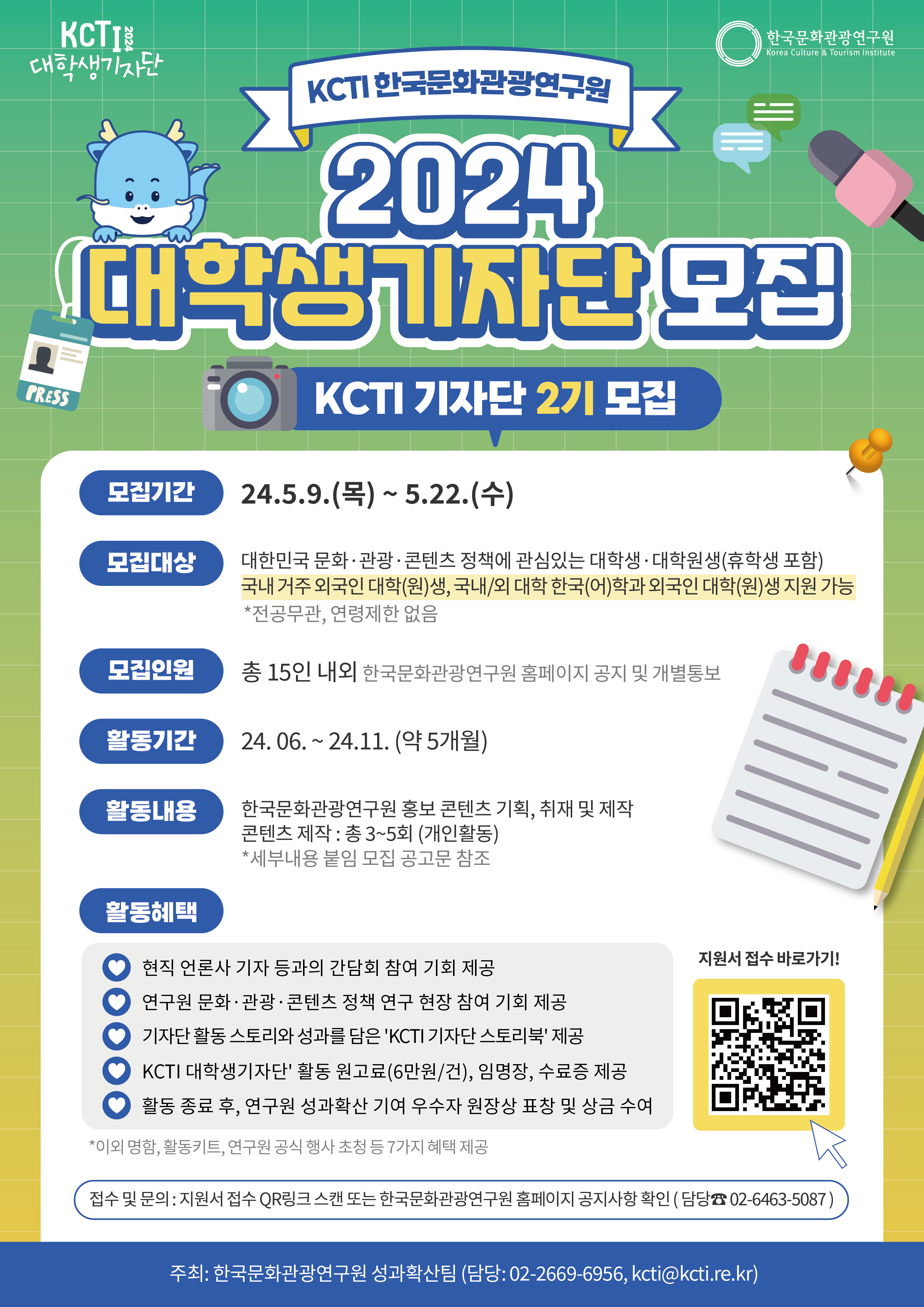| 제목 | 한국문화관광연구원 2024년 KCTI 대학생 기자단 제2기 모집 | ||||