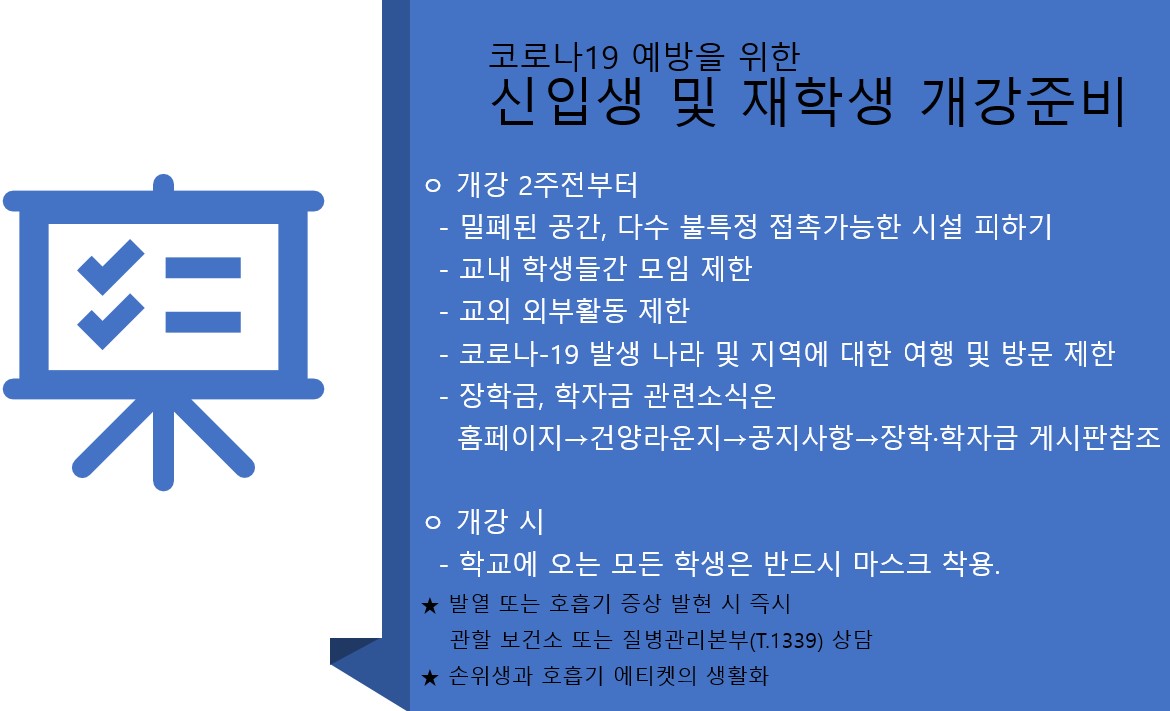 | 제목 | 코로나19 예방을 위한 신입생 및 재학생 개강준비 | ||||