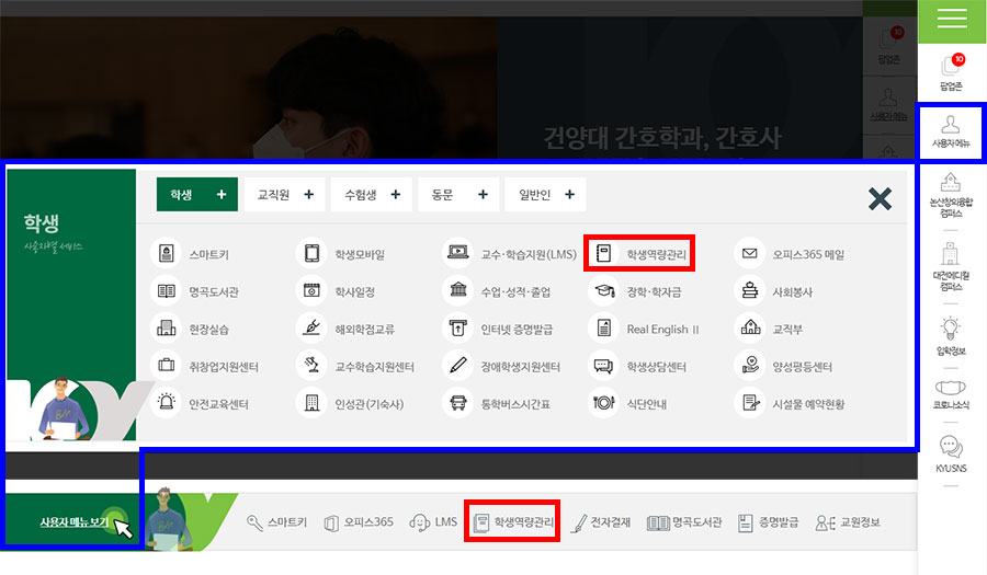 □ 대표홈페이지내 [건양학생역량관리시스템] 접속 방법 - 오른쪽 [사용자 메뉴] or 메인 이미지 아래 [사용자 메뉴 보기] 클릭 → 학생탭 → [학생역량관리] 클릭 - 메인 이미지 아래 빠른 메뉴 영역 → [학생역량관리] 클릭