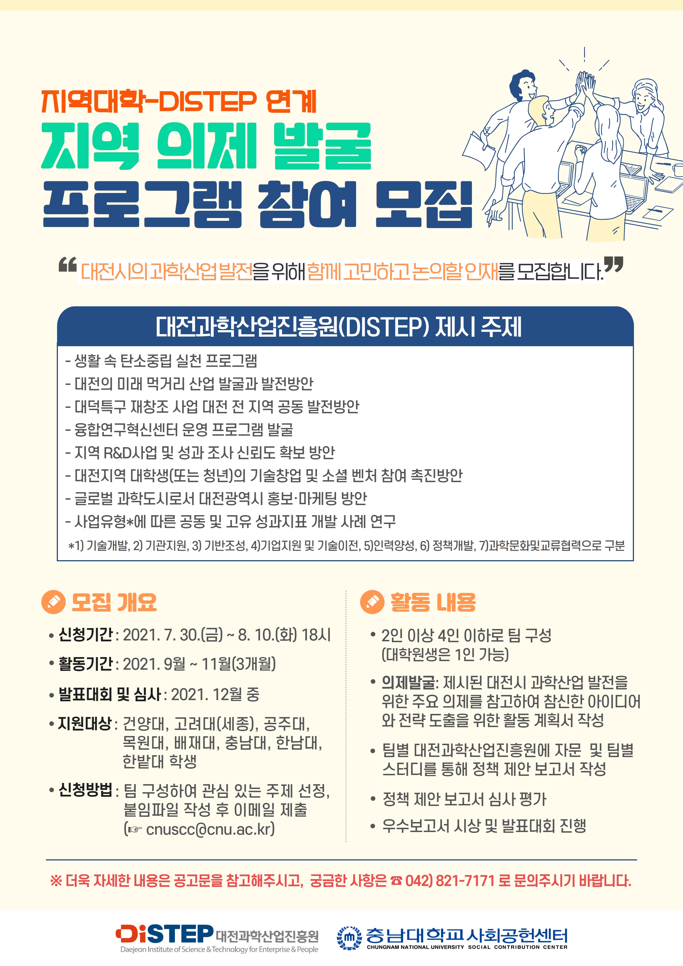 | 제목 | 지역대학-대전과학산업진흥원 연계 지역의제 발굴 프로그램 참여 안내 | ||||