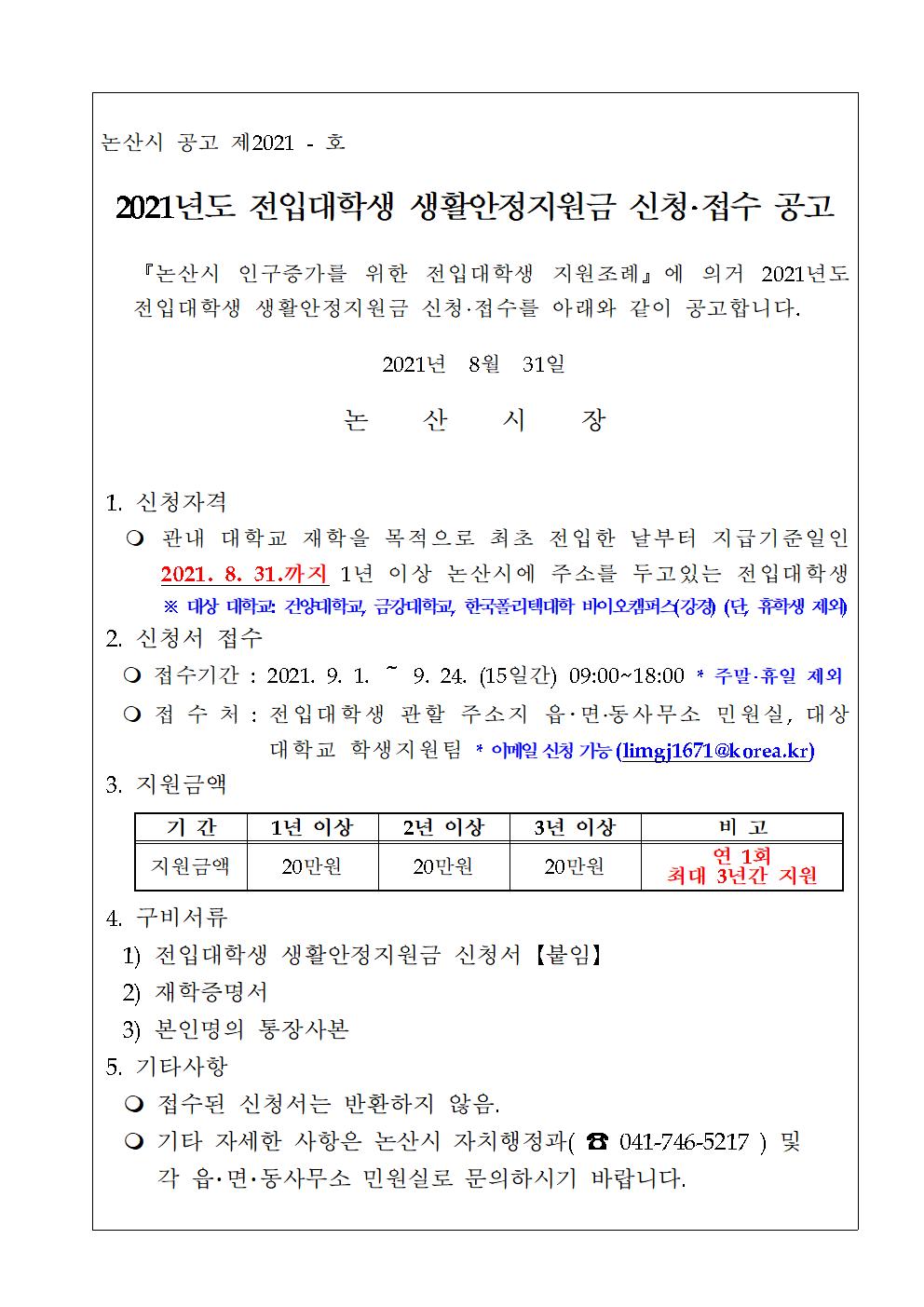 | 제목 | 2021년도 전입대학생 생활안정지원금 신청,접수 공고 | ||||