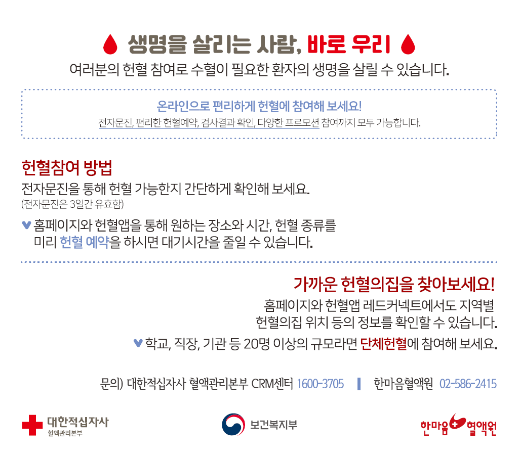 코로나19 장기화로 인한 헌혈감소 등으로 혈액수급 '주의단계' 진입 우려에 따라 헌혈 참여를 안내합니다.