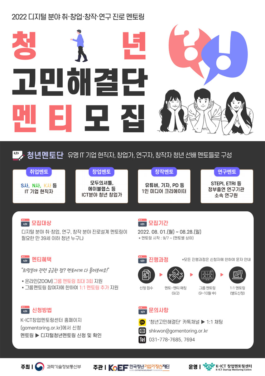 ○ 모집 기간 22. 8. 1(월) ~ 22. 8. 28(일) ○ 모집 대상(+졸업생 가능여부) 디지털 분야 취업 / 창업 / 연구 / 창작 계통으로 진로를 계획하고 있는 만 39세 이하 청년 누구나 ○ 활동 기간 9월 ~ 10월 중 그룹 멘토링 최소 1회, 최대 3회 진행 ○ 활동 혜택 그룹 멘토링 1회 이상 참여 시 1:1멘토링(1회) 참여 기회 제공 ○ 오프라인 모임 횟 수 (월 x회) 전체 온라인 진행 * 멘토 및 그룹원과 협의시 오프라인으로도 진행될 수 있음 ○ 지원 방법 K-ICT창업멘토링센터 홈페이지 지원 > 바로 가기 : https://bit.ly/3PNFsbS ○ 공식 카페/블로그 및 SNS - 페이스북 : https://bit.ly/3zsJq2K ○ 문의처 - 카톡채널 '청년고민해결단' 검색 > 일대일 문의 > 바로가기 : http://pf.kakao.com/_GuxmJb/chat