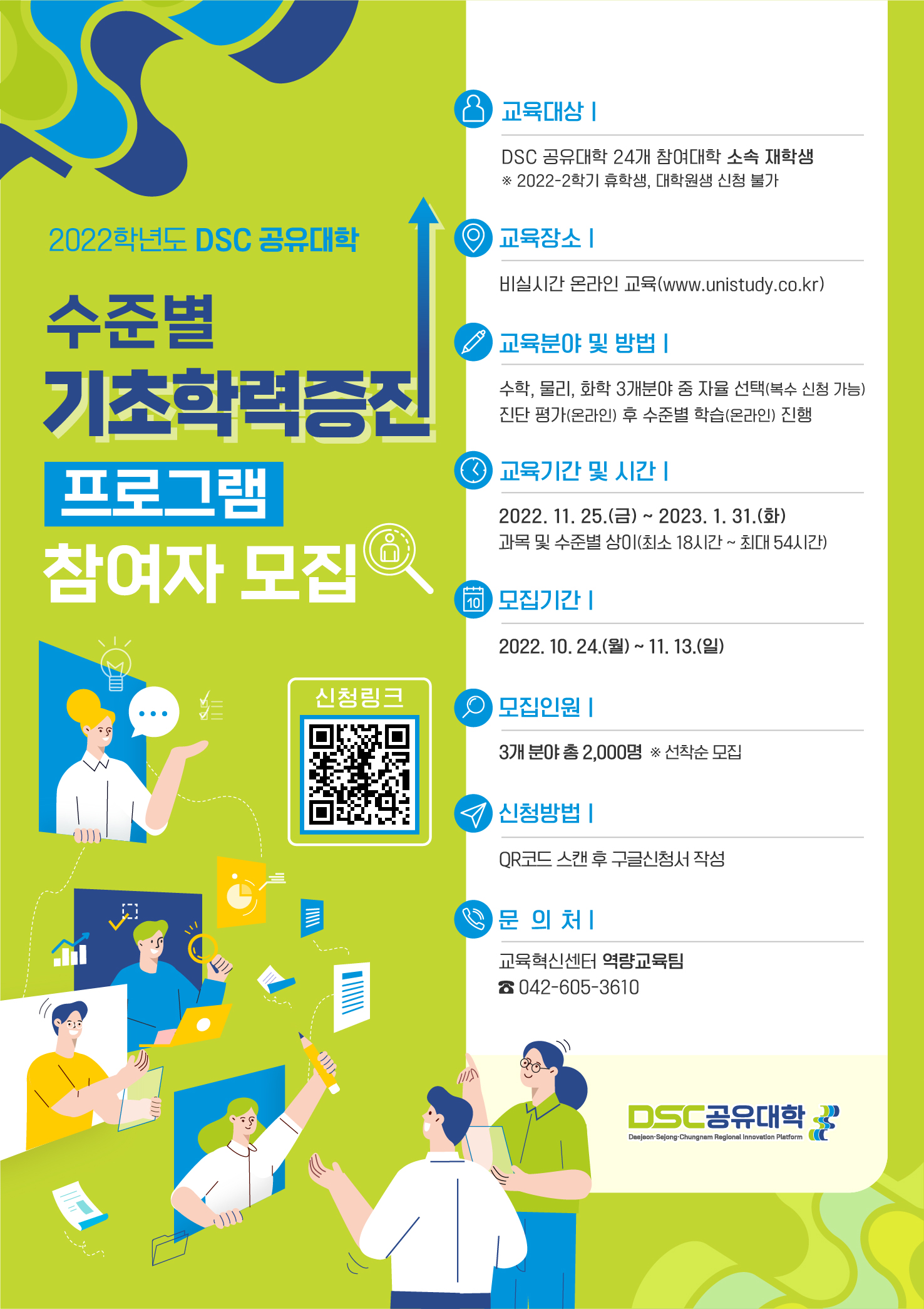 | 제목 | [DSC 공유대학] 2022학년도 DSC 공유대학 수준별 기초학력증진 프로그램 참여자 모집 (※신청기간 연장) | ||||