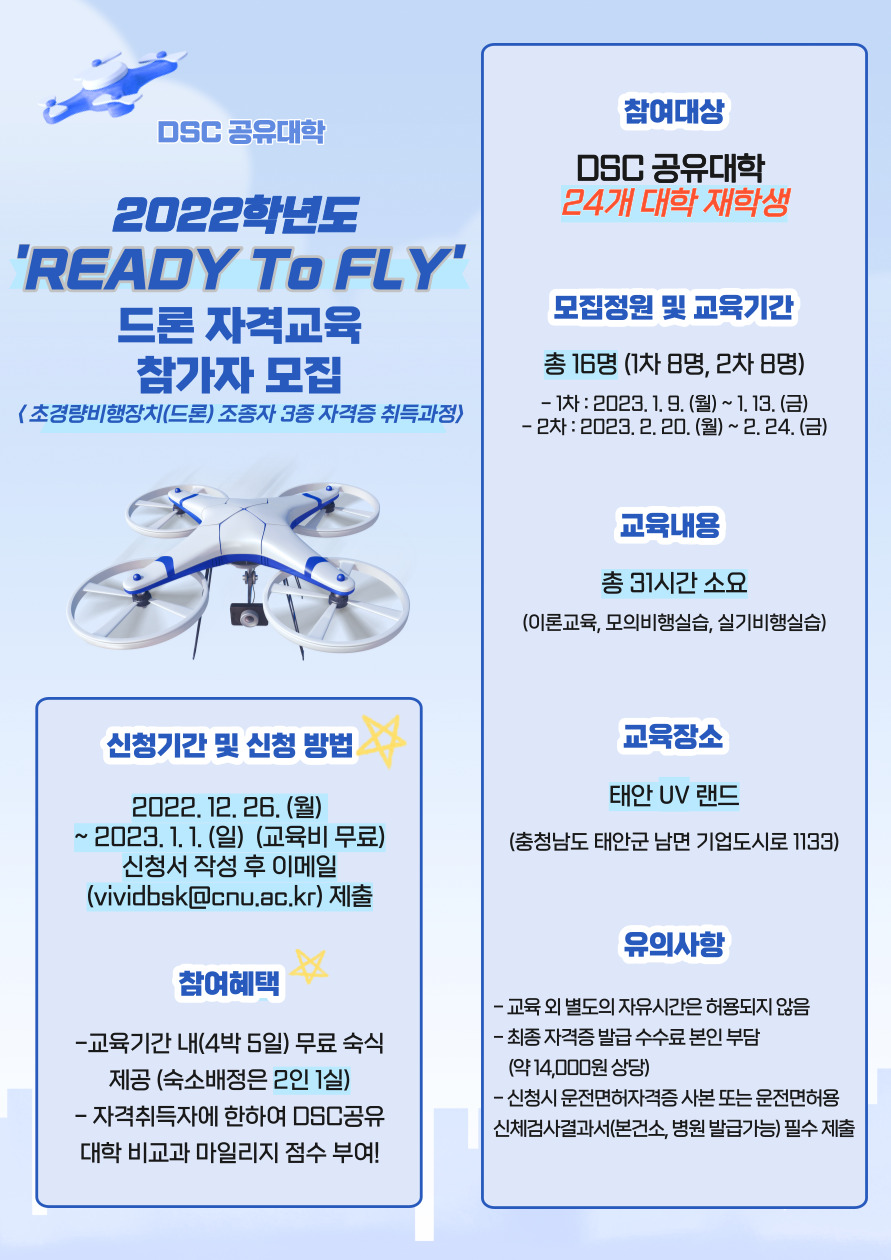 | 제목 | [DSC 공유대학] 2022학년도‘READY TO FLY’ 드론 자격교육 신청안내(수정) | ||||