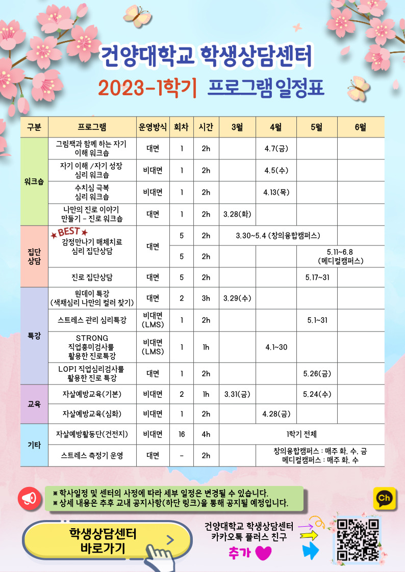 | 제목 | [학생상담센터] 2023년 1학기 프로그램 일정 안내 | ||||