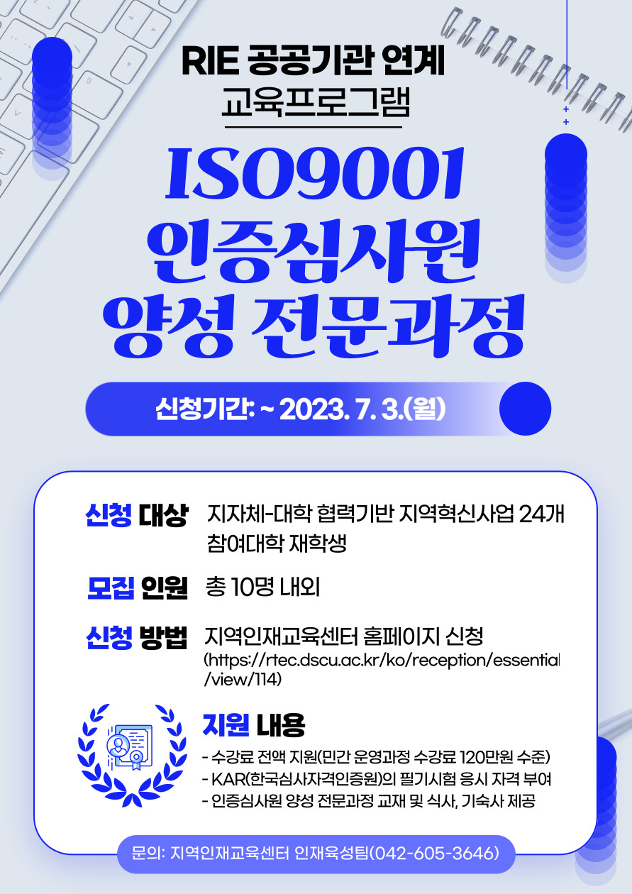 | 제목 | RIE 공공기관 연계 교육프로그램(ISO9001 인증심사원 양성 전문과정) 모집 안내 | ||||