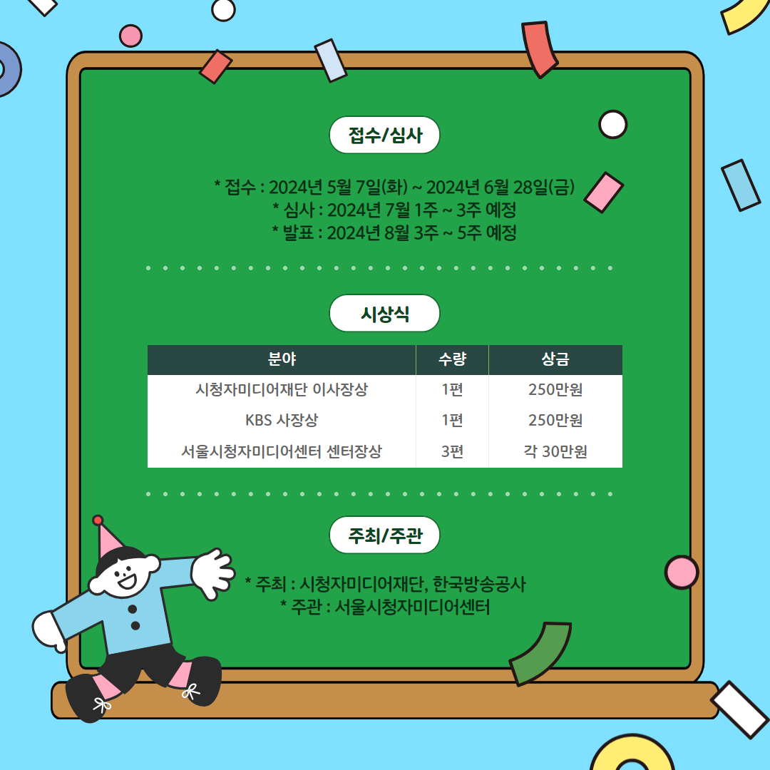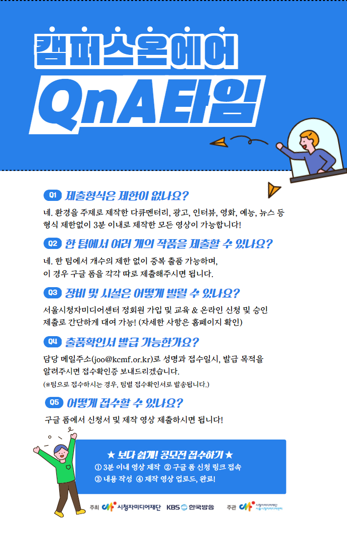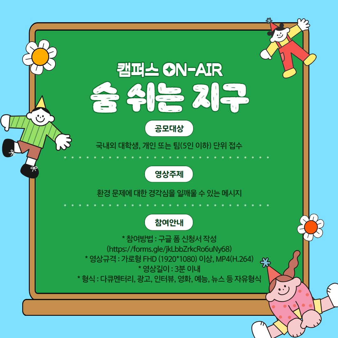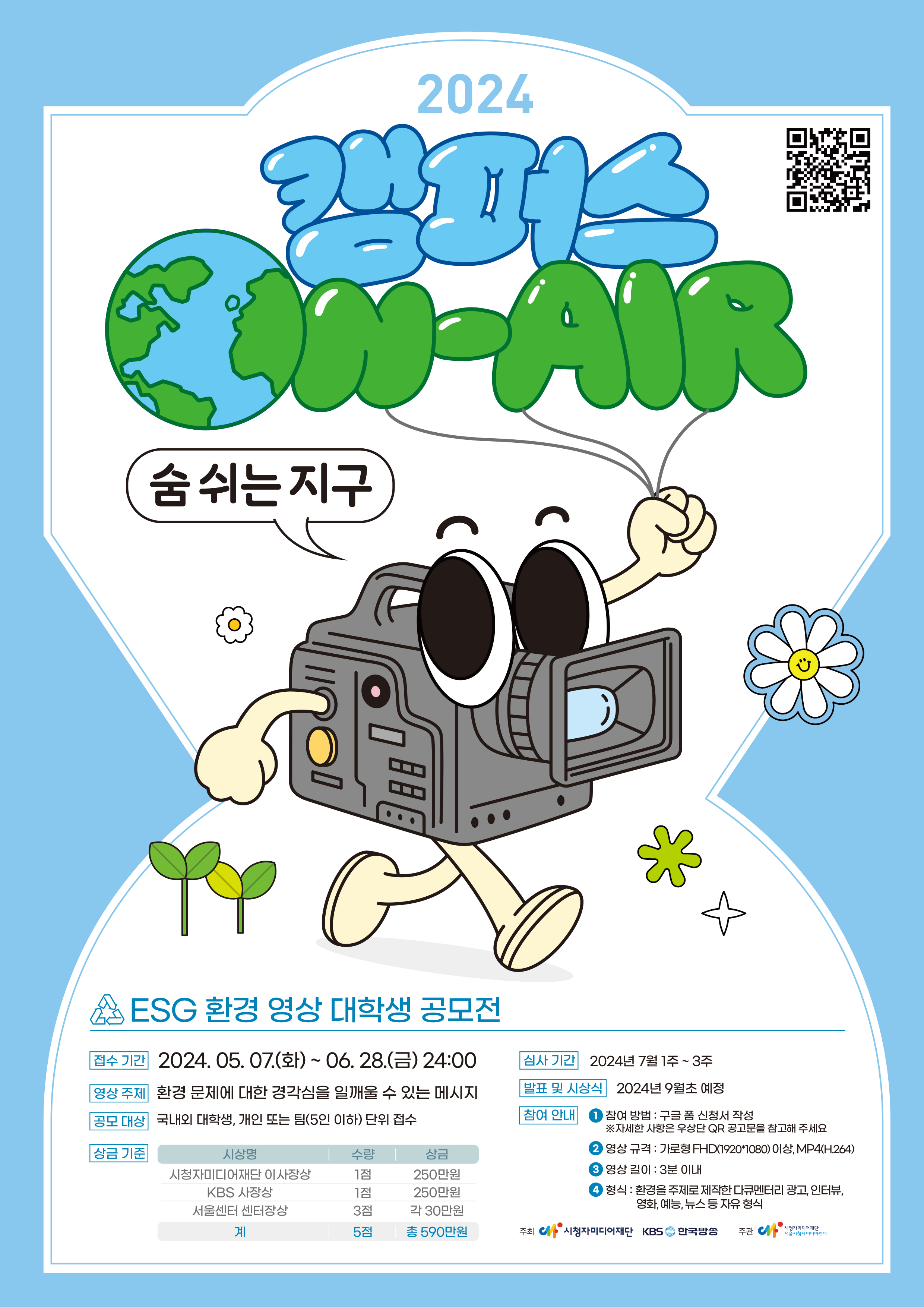 | 제목 | 서울시청자미디어센터-KBS 공동주최 환경영상공모전 <2024 캠퍼스온에어-숨쉬는 지구> 홍보 | ||||