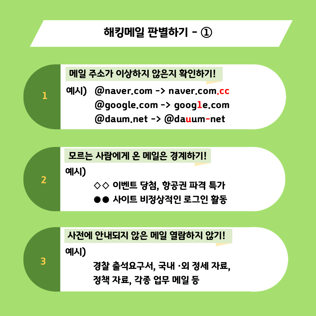 최근 이메일을 통한 해킹 시도가 눈에 띄게 증가하고 있으며 개인정보유출사고 등 해킹사고 최초 침입경로의 35%가 ‘이메일’을 통해서 발생하고 있습니다. 이러한 해킹 사고의 대부분은 기관 및 공공기관 사칭해 이루어지며 악성코드를 은닉한 첨부파일이나 가짜 웹사이트 링크 등이 포함된 이메일 공격으로 구성됩니다. 이에 정보통신원에서는 이메일을 통한 침해사고 피해 발생 예방을 위해 2회에(11월~12월) 걸쳐 ‘해킹 메일 판별법’과 ‘이메일 수신 유의사항‘을 안내 드리고자 합니다. 첫 번째로 ‘해킹 메일 판별법’을 안내드리니 아래 내용을 참조하시어 보안강화 부탁드립니다.