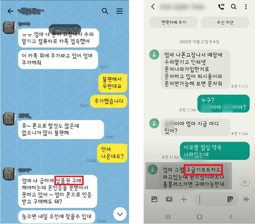 [그림1] 가족을 사칭하여 상품권 구매를 요구하는 화면 2. ‘주민등록증 사본’ 등 개인 · 신용정보를 요구 하며 피해자로부터 얻어낸 신분증(사진) 및 개인 · 신용정보를 활용해 피해자 명의의 휴대전화를 개통하고 금융사의 비대면 서비스를 이용해 계좌 개설 및 고액 대출을 받아 금전을 탈취하는 방식을 사용 □ 피해 예방 방법 1. 가족 등 지인이 문자 또는 메신저로 금전이나 개인정보 등을 요구하는 경우 반드시 유선 통화를 통해 확인 2. 상대방이 “휴대폰이 고장 났다” 거나 “휴대폰을 잃어버렸다”고 하는 경우 피싱 확률이 높아 대화 중단 3. 자녀를 사칭해 휴대폰 원격제어 애플리케이션(앱) 설치를 유도하는 경우 출처가 불분명한 앱의 설치 지양 4. 피해 발생시 송금 또는 입금한 금융회사 콜센터 및 금융감독원 콜센터에 신고하여 해당 계좌의 지급정지 요청 및 피해구제 신청 접수 5. 개설된 계좌 및 대출은 ‘계좌정보통합관리서비스’에서 확인 가능 6. 핸드폰 개통 이력은 한국정보통신진흥협회의 ‘명의도용방지서비스’를 통해 확인 가능