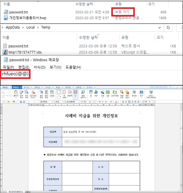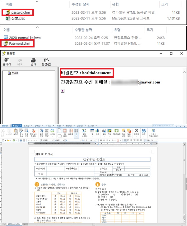 최근 패스워드 파일로 위장하여 정상 문서 파일과 함께 압축 파일로 유포되는 악성 코드가 식별되어 사용자의 주의가 요구 됩니다. 보안 전문업체 ‘안랩’에 따르면 해당 유형의 악성코드는 이메일 등을 통해 정상 문서 파일과 함께 유포되어 사용자가 악성파일임을 인지하기 어렵고 첨부된 파일에 암호가 설정되어 있어 사용자가 암호를 확인하기 위해 악성 첨부 파일을 실행하도록 유도하는 것으로 확인되었습니다. 악성 첨부 파일은 .chm(윈도우 도움말 파일 확장자) 과 .lnk(바로가기 확장자) 유형으로 작성되어 있으며 사용자가 해당 파일을 실행 시 활성화 되어 공격자의 명령어수신, 명령 실행 결과 전달 등 악성 행위를 수행합니다. [그림] .chm 유형의 악성 파일 (출처 : 안랩 보안 블로그)