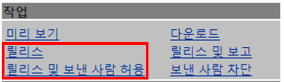 ‘격리’ 된 메일의 열람이 필요하거나 사용자 사서함에 수신을 허용하고 싶은 경우 [릴리스] 또는 [릴리스 및 보낸 사람 허용]을 클릭하여 적용 할 수 있습니다.