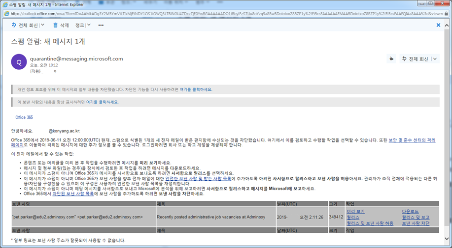 최근 교내 오피스365 서비스 사용자를 대상으로 스팸 및 악성코드 포함 메일이 지속적으로 수신되고 있어 사용자의 주의가 요구됩니다. 이에 정보통신원에서는 메일 수신과 관련하여 메일필터 규칙을 상향 적용하였으며 스팸 및 악성코드 메일로 의심되는 항목에 대해 ‘스팸 알림’ 메일 발송 서비스를 적용 하였습니다. ‘스팸 알림’ 메일은 전일까지 수신된 메일 중 악성코드 포함이 의심되거나 스팸 메일로 의심되는 항목에 대해 사용자 사서함에 즉시 수신되지 않도록 ‘격리’ 기능을 적용하며 취합된 의심메일 리스트를 사용자에게 안내합니다. [그림1] ‘스팸 알림’ 메일 수신화면 이를 통해 사용자는 해당 메일의 수신여부를 설정할 수 있으며 이후 수신되는 메일에 대해 발신자의 허용 · 차단 여부 관리가 가능 합니다.