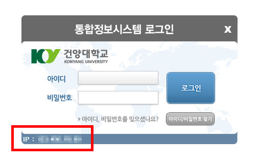 통합정보시스템 사용시 행정업무를 처리하기 위해선 교내 IP가 허용된 단말기 또는 네트워크 환경에서만 로그인이 가능합니다.