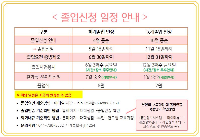 2021학년도 전기 졸업신청 일정 안내드립니다. ☞ 졸업신청링크 : https://forms.gle/TDbdoEv1yLx8upXC7 졸업신청이란? 졸업예정자(대상자)가 학과내규 또는 대학졸업인증 요건을 어느 정도 충족하였는지를 파악하기 위한 온라인 신청입니다. 졸업예정자(대상자)는 꼭 신청 바랍니다. 졸업요건 증빙서류는 hjh1254@konyang.ac.kr 또는 kyglo5537@gmil.com 으로 제출해주시기 바랍니다. 감사합니다. |