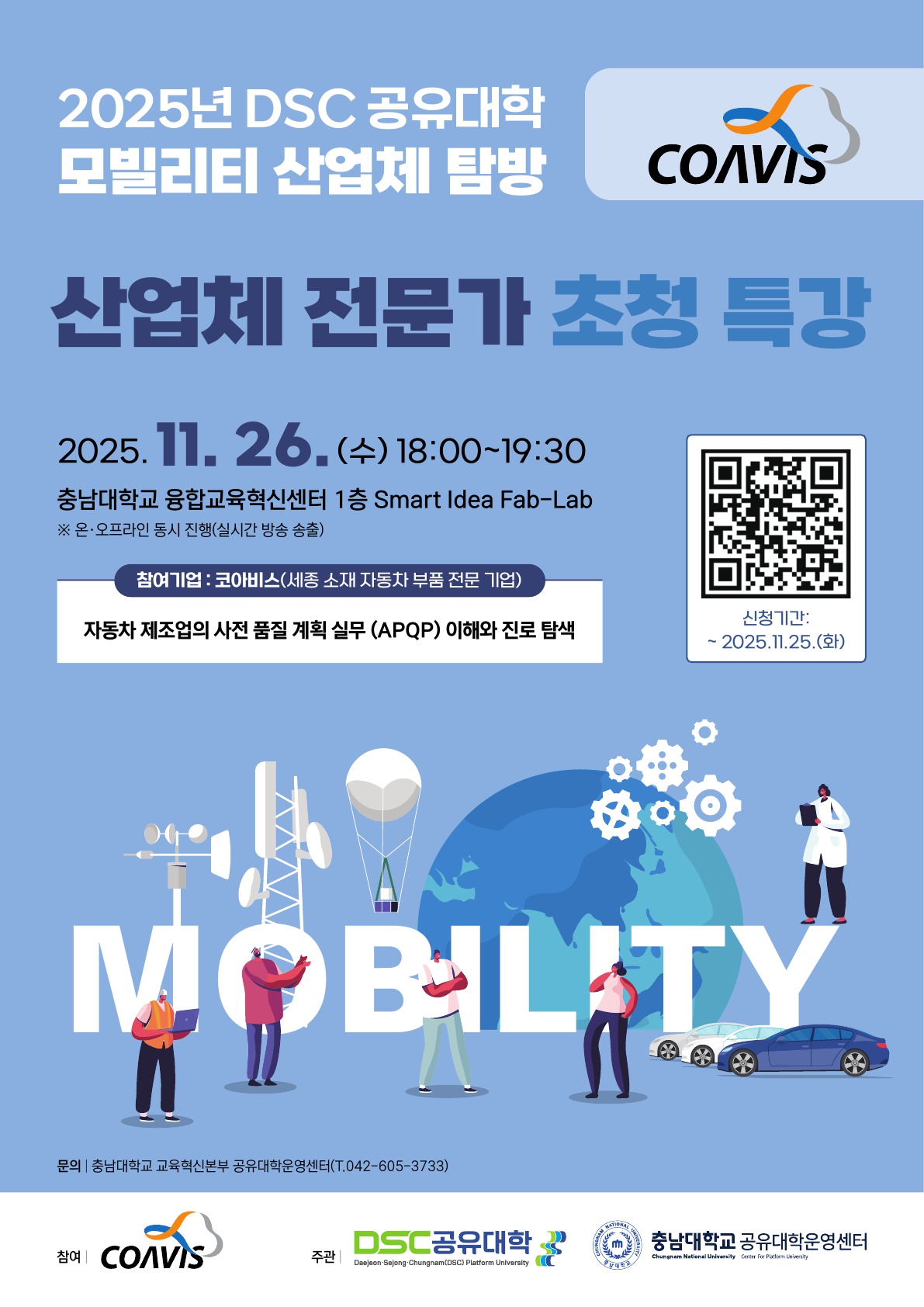 『 2025년 DSC 공유대학 산업체 전문가 초청 특강 안내 (코아비스) 』글의 상세내용을 확인하는 표로 제목, 부서명, 등록일, 조회, 첨부, 내용으로 나뉘어 설명합니다.