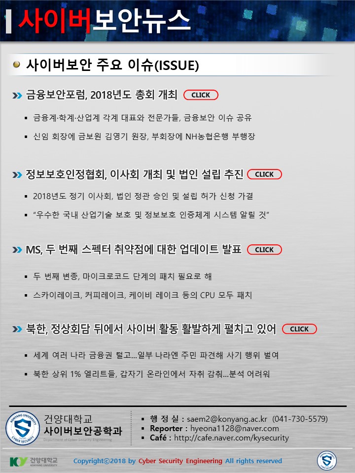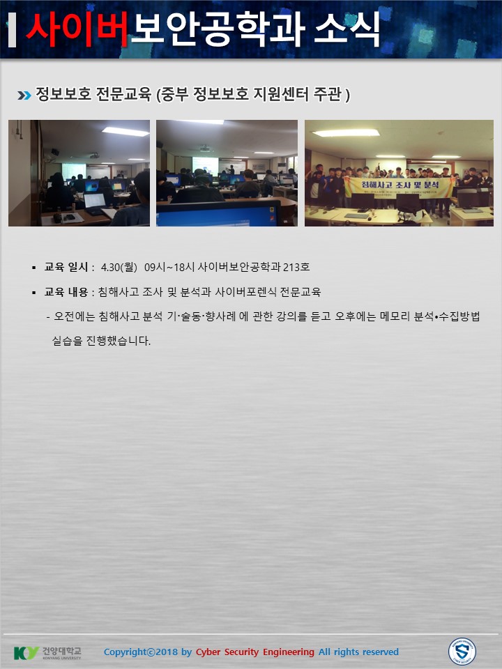 『 사이버보안공학과 보안매거진 2018-2호 』글의 상세내용을 확인하는 표로 제목, 부서명, 등록일, 조회, 첨부, 내용으로 나뉘어 설명합니다.