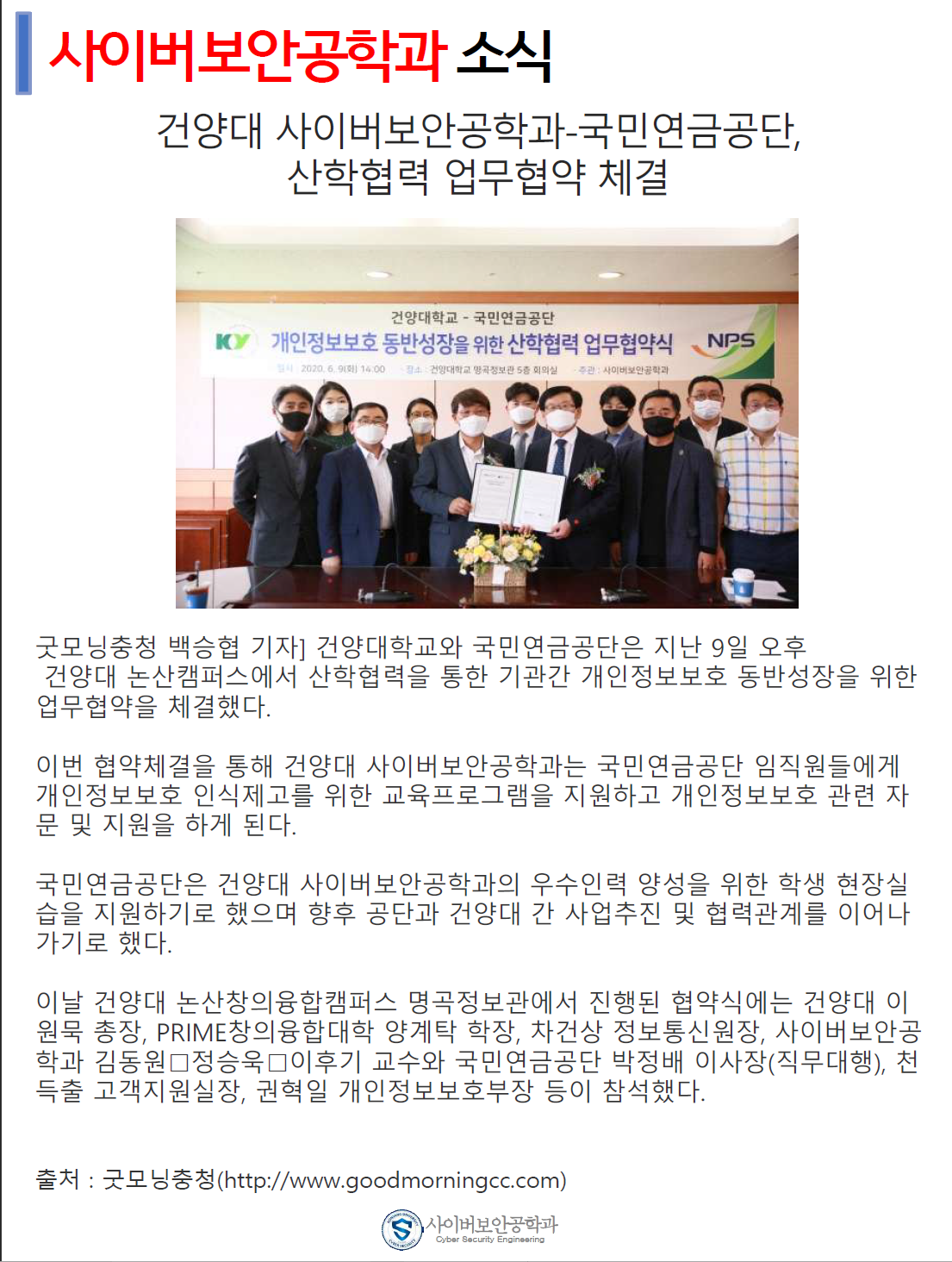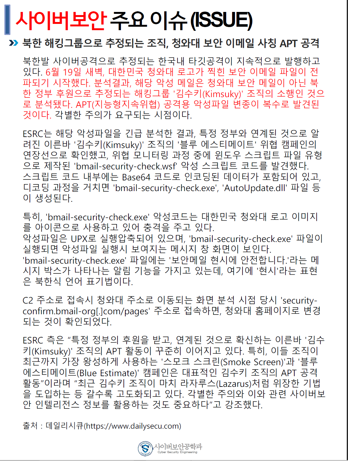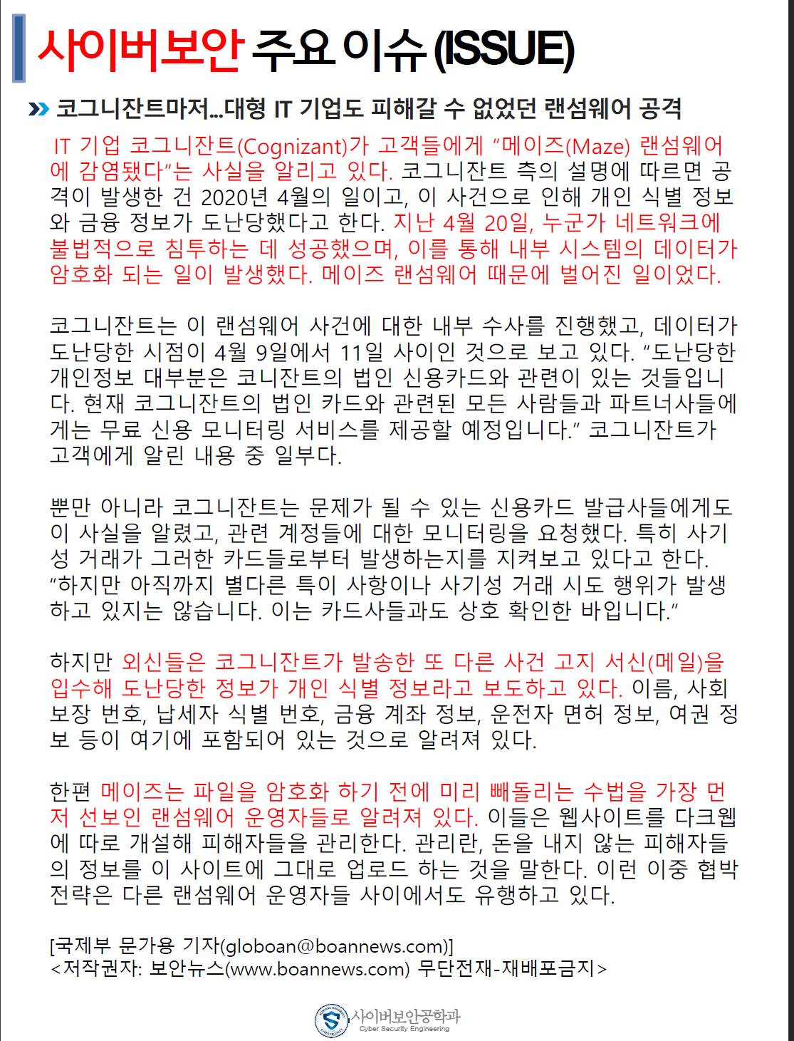 『 사이버보안공학과 보안매거진 2020-4호 』글의 상세내용을 확인하는 표로 제목, 부서명, 등록일, 조회, 첨부, 내용으로 나뉘어 설명합니다.