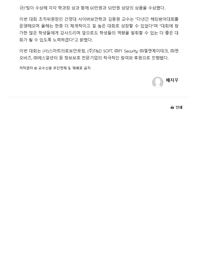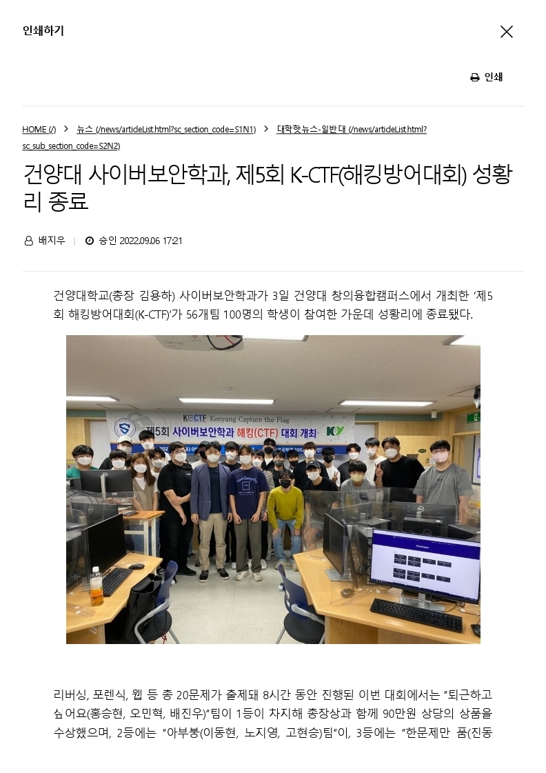 『 건양대학고 사이버보안학과 제5회 K-CTF(해킹방어대회) 성황리 종료 』글의 상세내용을 확인하는 표로 제목, 부서명, 등록일, 조회, 첨부, 내용으로 나뉘어 설명합니다.
