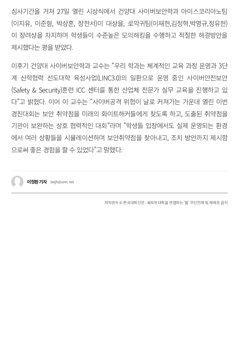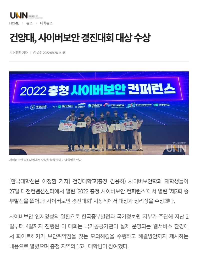『 건양대, 사이버보안 경진대회 대상 수상 』글의 상세내용을 확인하는 표로 제목, 부서명, 등록일, 조회, 첨부, 내용으로 나뉘어 설명합니다.