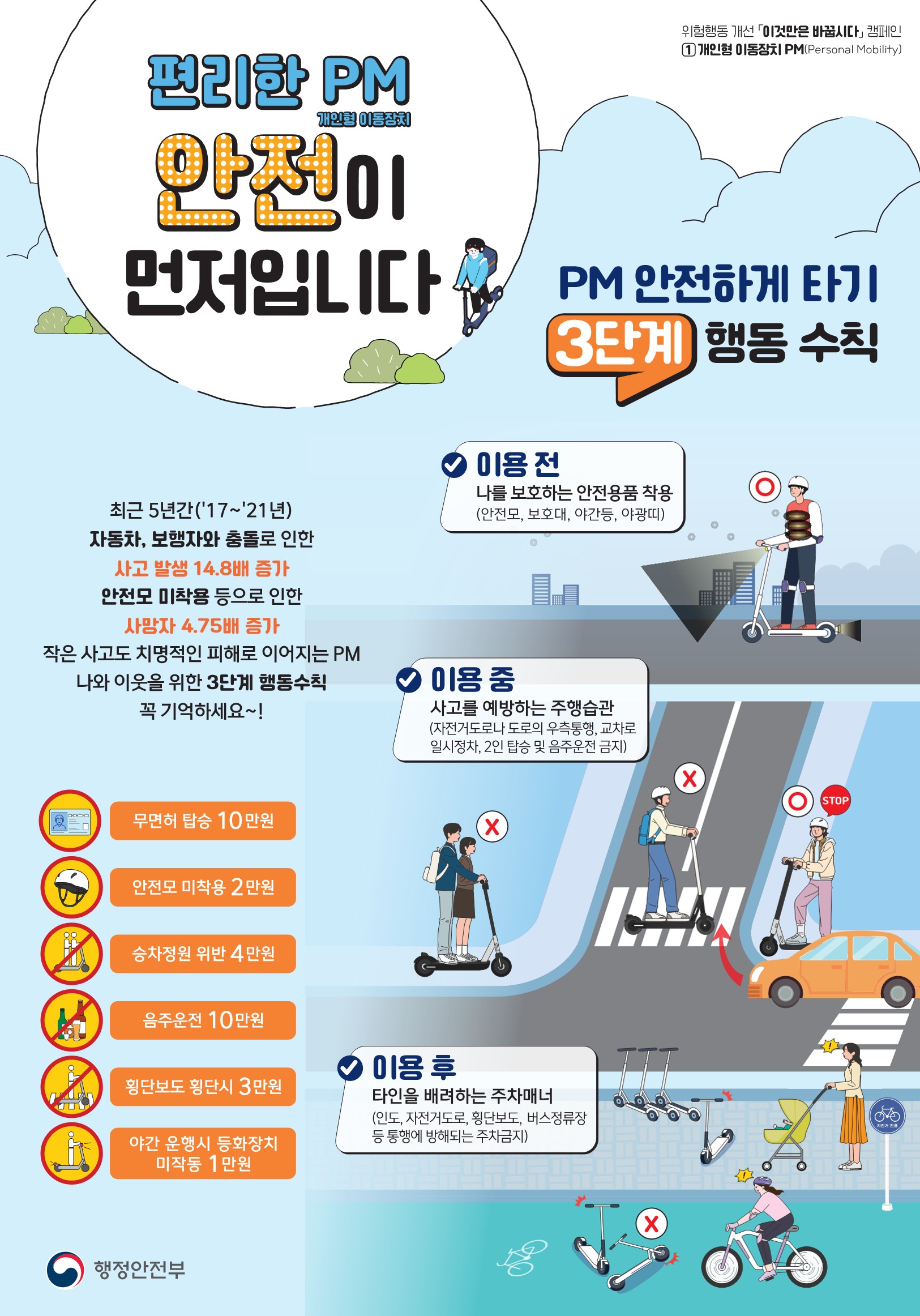교내 개인형 이동장치(PM) 안전관리를 위한 홍보자료 및 전파사항를 안내드립니다. - 개인형 이동장치(PM) 안전수칙 준수 - 교내 충전 금지 - 사고발생 시 즉시 신고 (개인 보험 가입 권고, 대학 상해보험 청구 불가) - 공유형 킥보드 교내 주차불가