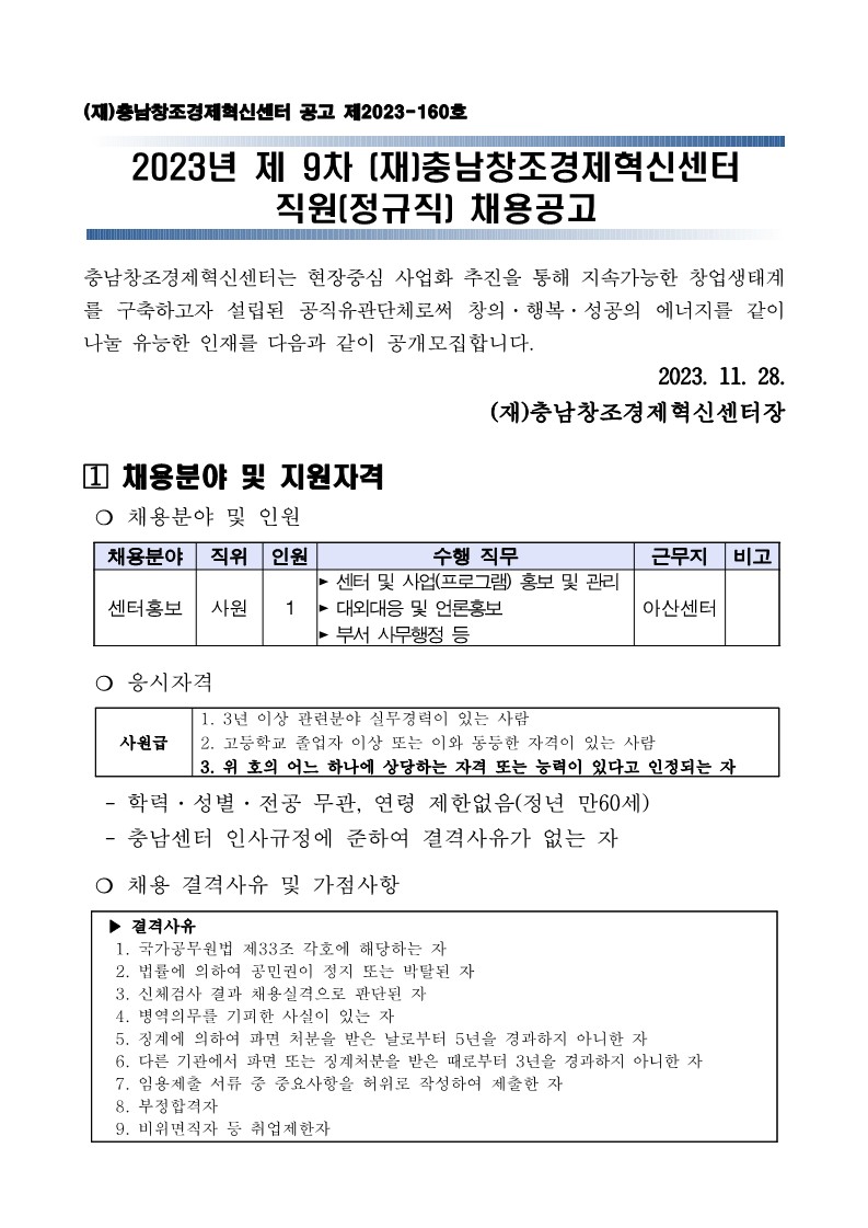 | 제목 | [충남창조경제혁신센터] 제 9차 직원(정규직) 채용 (~12/12) | ||||