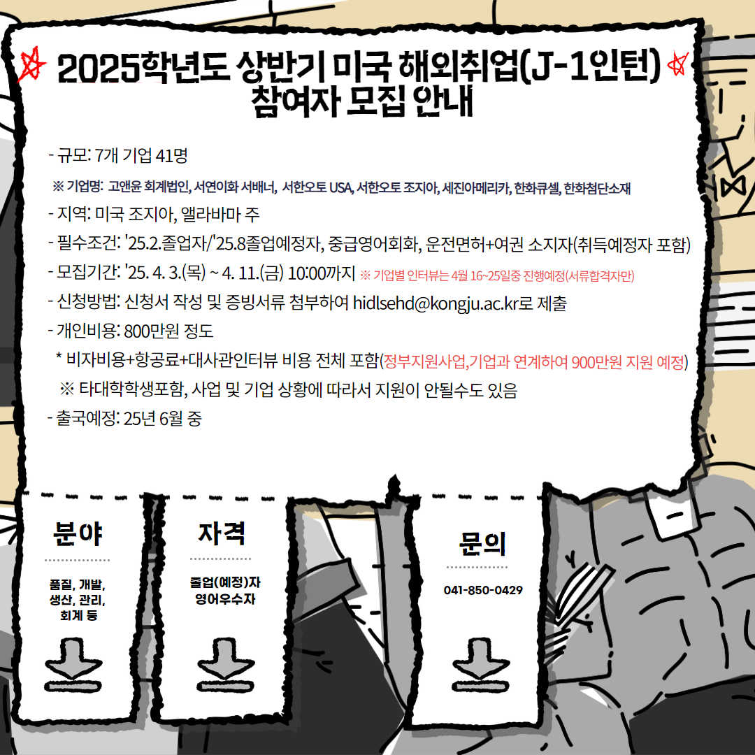 | 제목 | 2025학년도 상반기 미국 해외취업(J-1인턴) 참여자 모집 안내(~4/11) | ||||