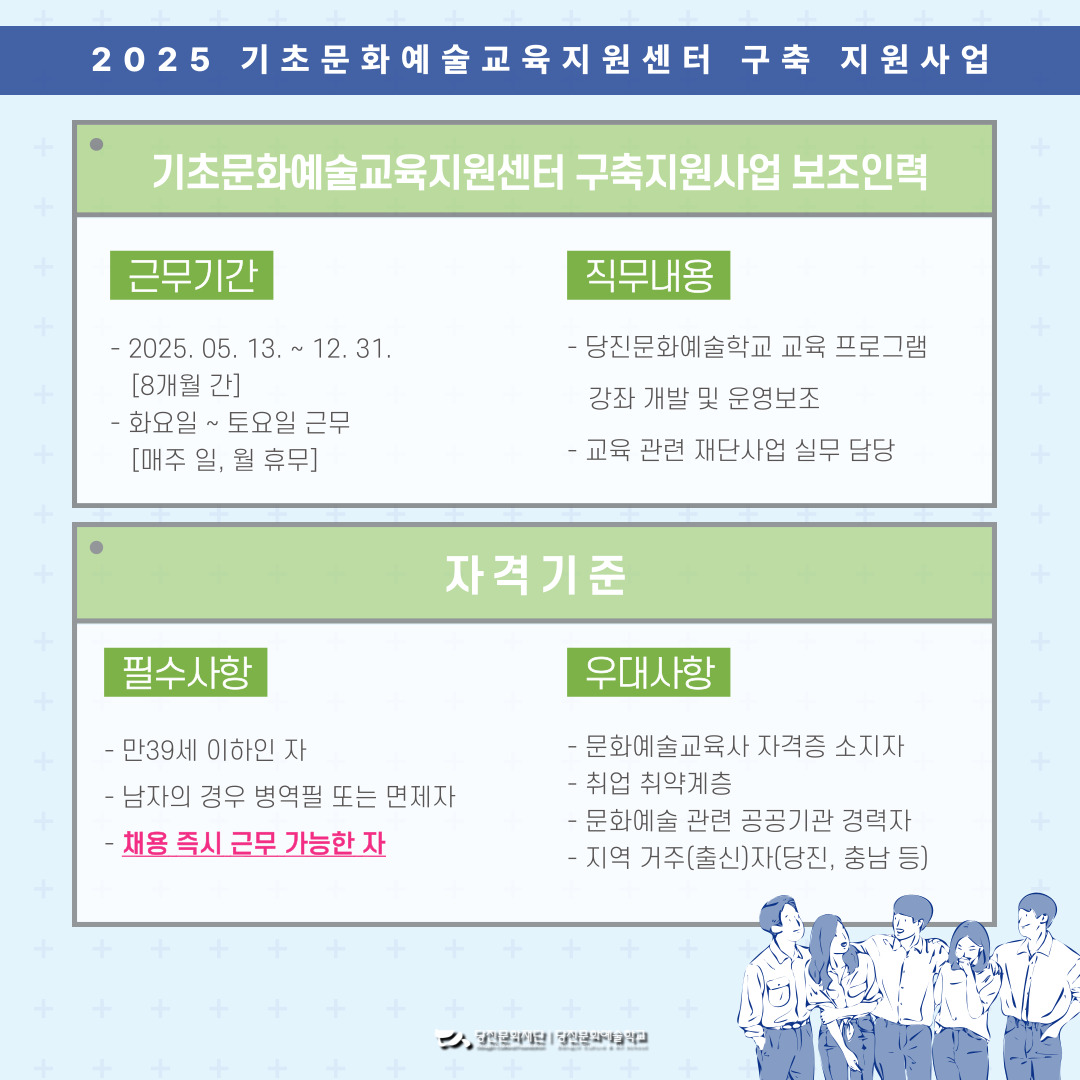 가. 공 고 명 : [2025 기초문화예술교육지원센터 구축 지원사업] 보조인력 채용 나. 채용분야