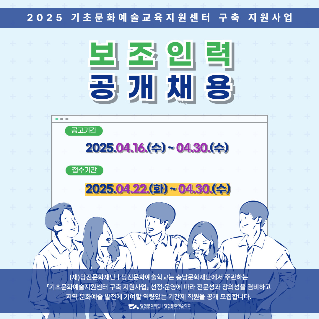 | 제목 | [당진문화재단]2025 기초문화예술교육지원센터 구축 지원사업 보조인력 채용(~4/30) | ||||