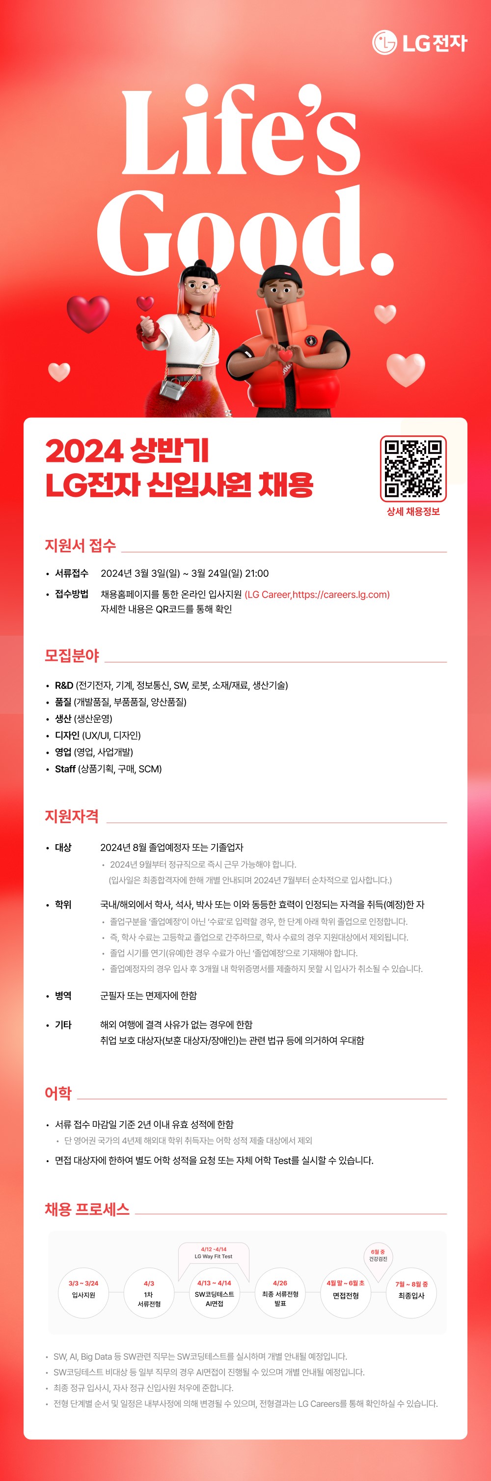 | 제목 | [LG전자] 2024년 상반기 신입사원 채용(~3/24) | ||||