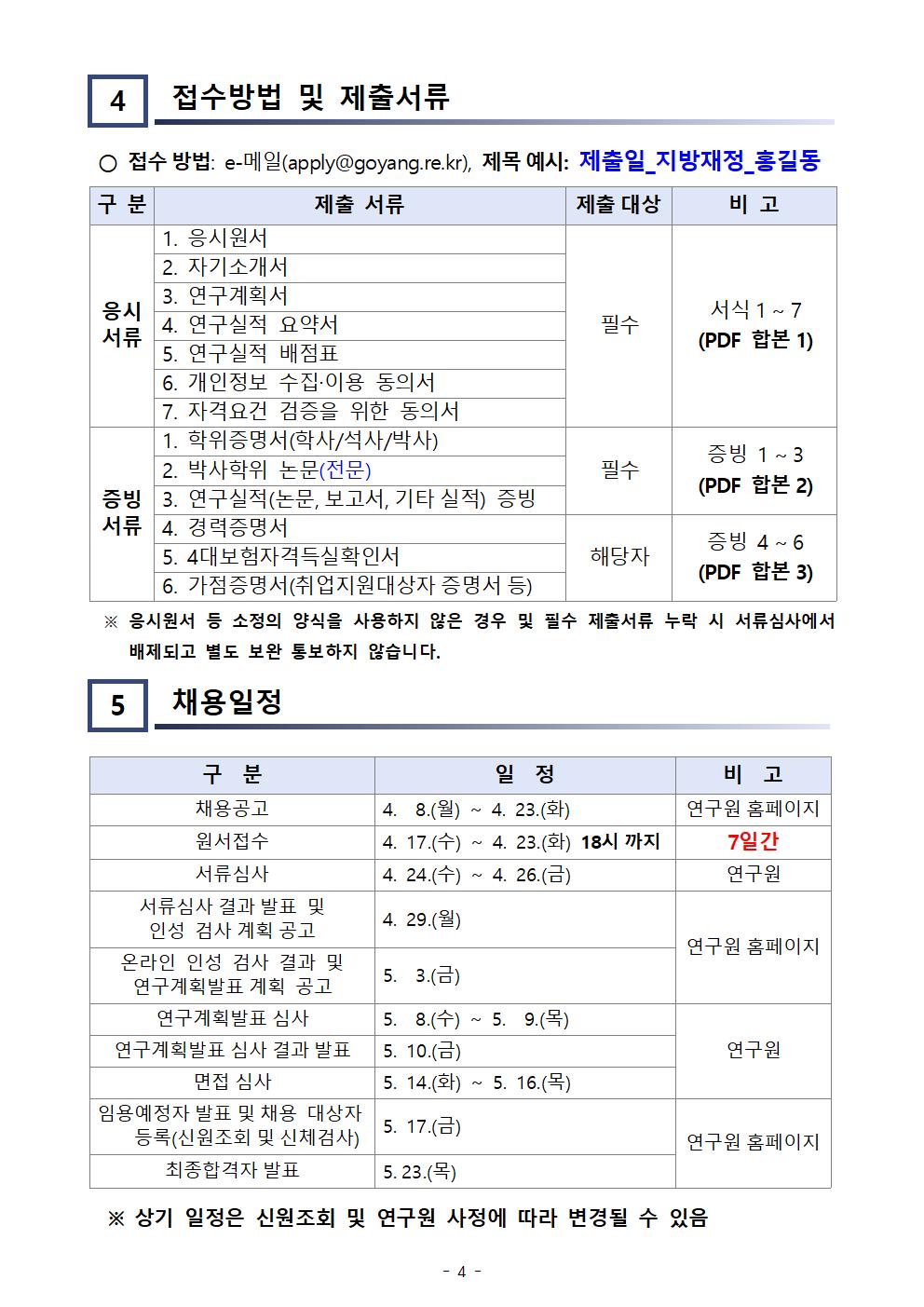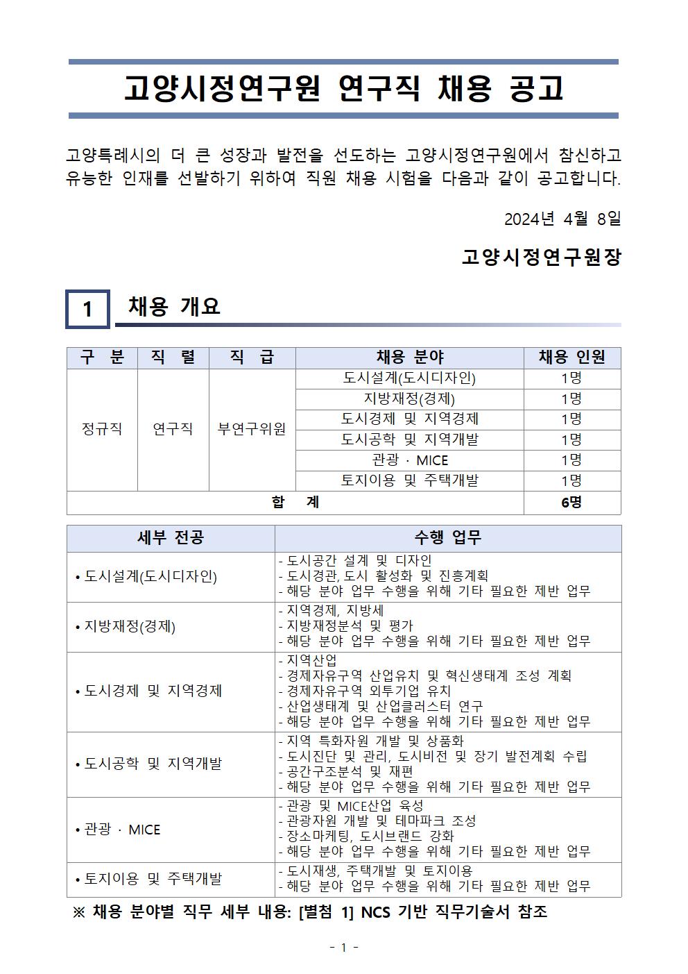 가. 공 고 명 : 고양시정연구원 연구직 채용 공고 나. 공고 및 접수기간 : 2024. 4. 8.(월) ~ 2023. 4. 23.(화) (16일 간) 다. 채용 공고 URL - https://www.goyang.re.kr/news/04_view.php?num=297&page=1&make=&search=