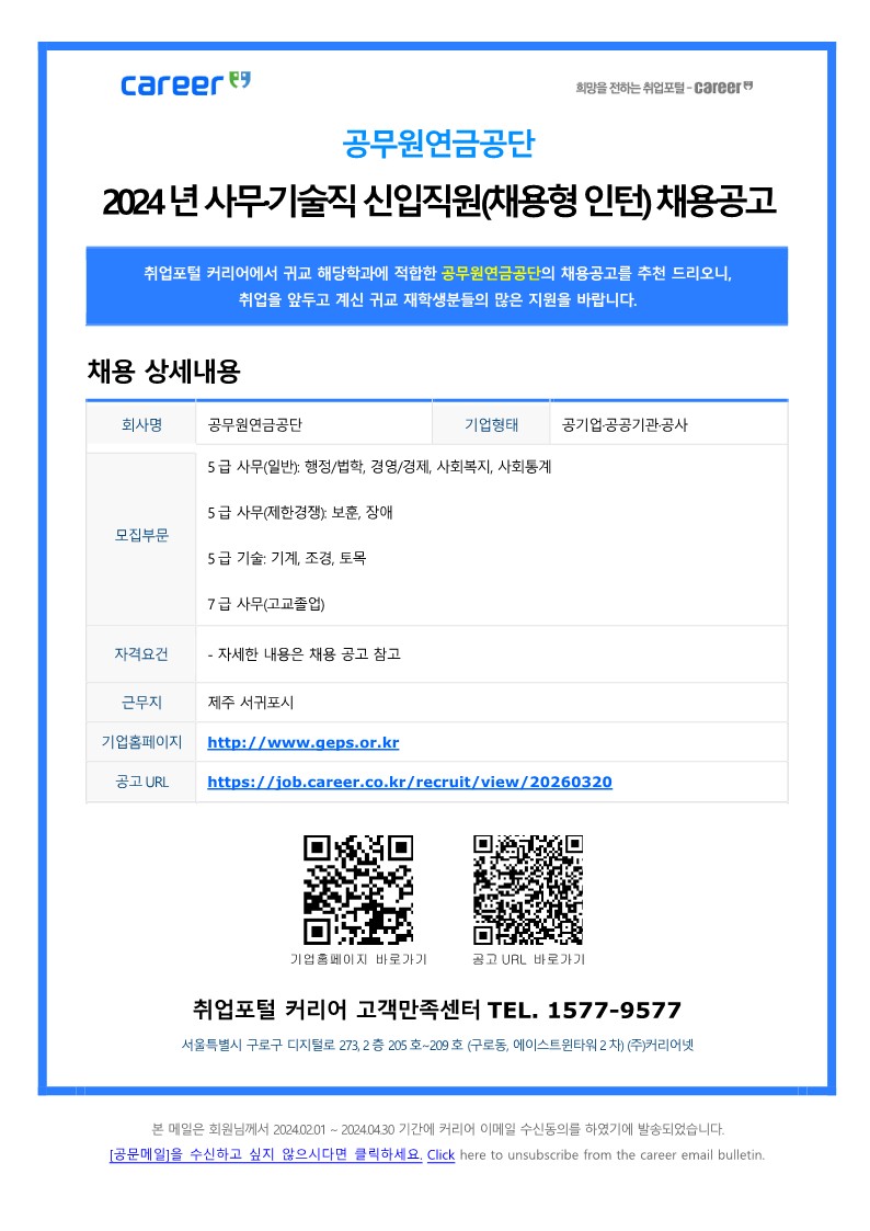 제목 [공무원연금공단] 사무·기술직 신입직원(채용형 인턴) 채용(~5/14)