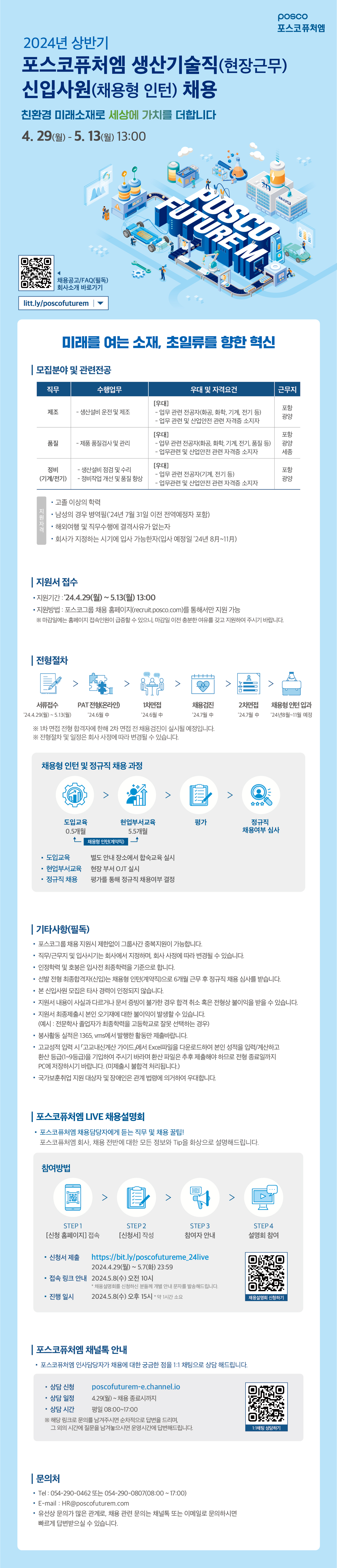 제목 [포스코퓨처엠] 2024년 상반기 포스코퓨처엠 생산기술직(현장근무) 신입(채용형 인턴) 채용 (~5/13 )
