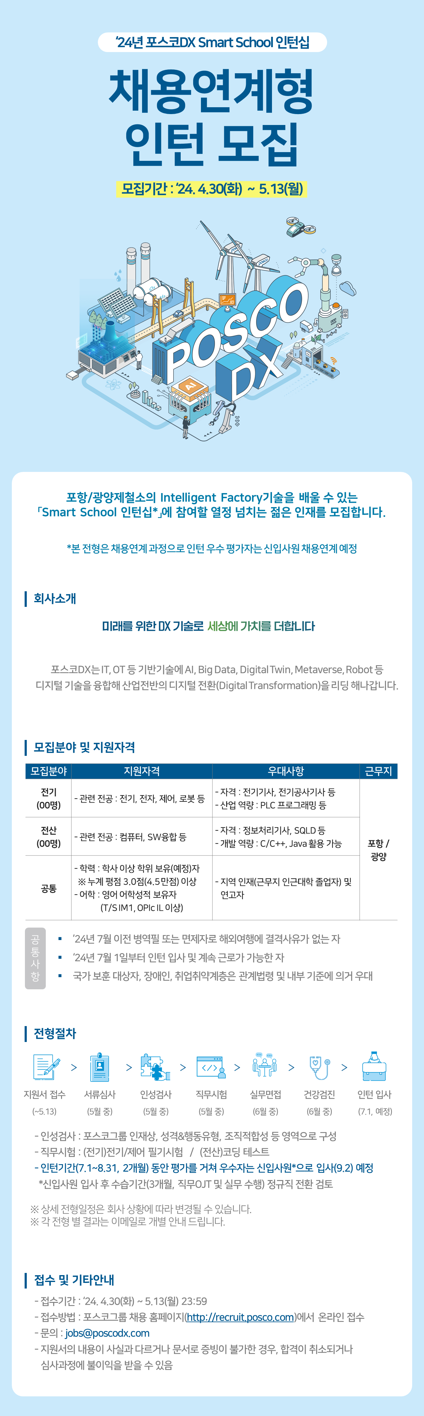 [포스코DX] ’24년 Smart School 인턴 선발 [채용연계형](~5/13) 글의 상세내용