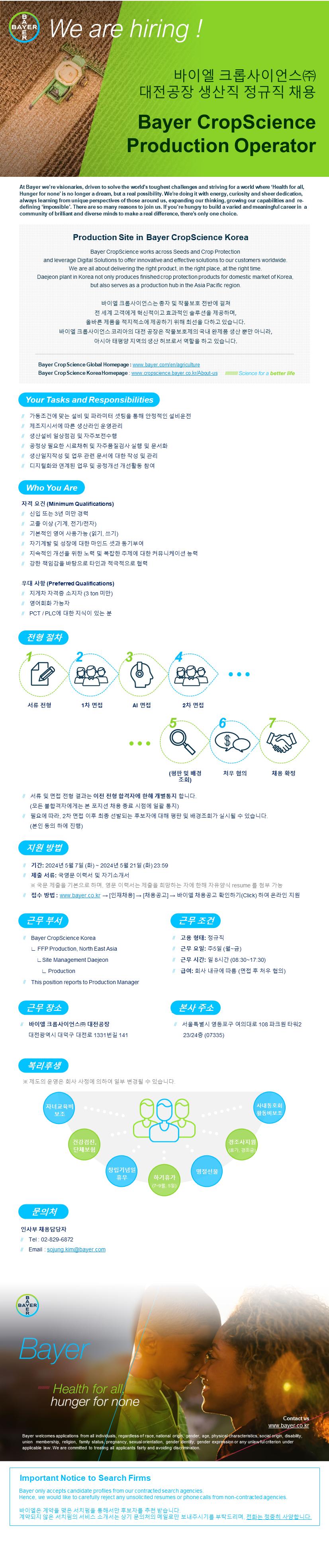 제목 [바이엘 크롭사이언스] 대전공장 생산직 (Production Operator) 정규직 채용(~5/21)