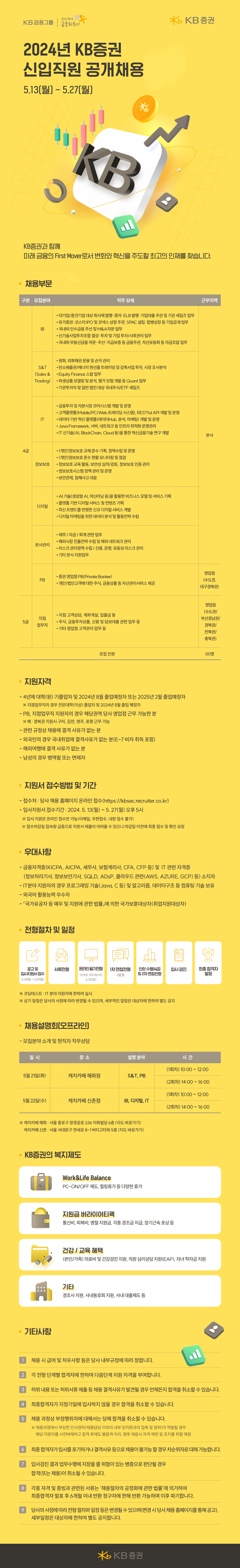 2024.05.27(월) 17:00까지 - 접수 방법 : https://kbsec.recruiter.co.kr (온라인 지원) ■ 모집분야 (4급) IB, S&T(Sales&Trading),