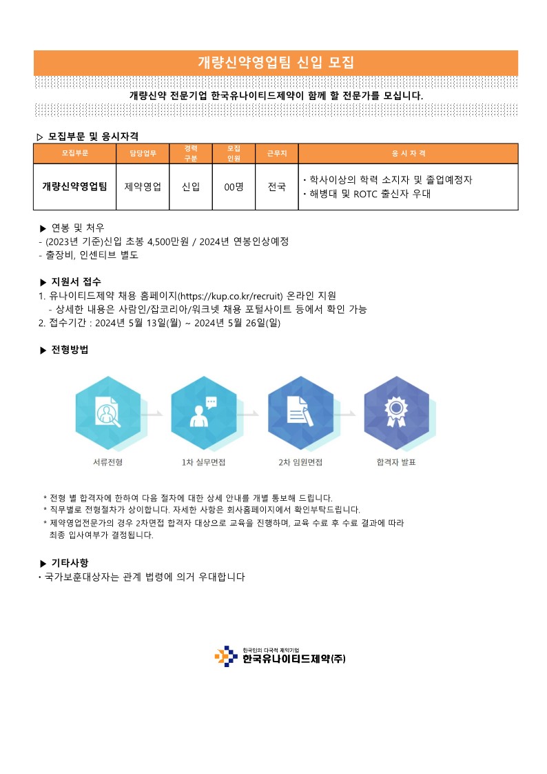 1) 모집기간 : 2024년 5월 13일(월) ~ 2024년 5월 26일(일) 2) 모집부문 직무 : 개량신약영업팀(MR) 담당업무 : 국내영업(의원, 병원 의사 대상) 경력 : 신입 인원 : 00명 근무지 : 전국(최종합격 후 협의) 응시자격 : 학사 이상의 학위 소지자 및 졸업예정자