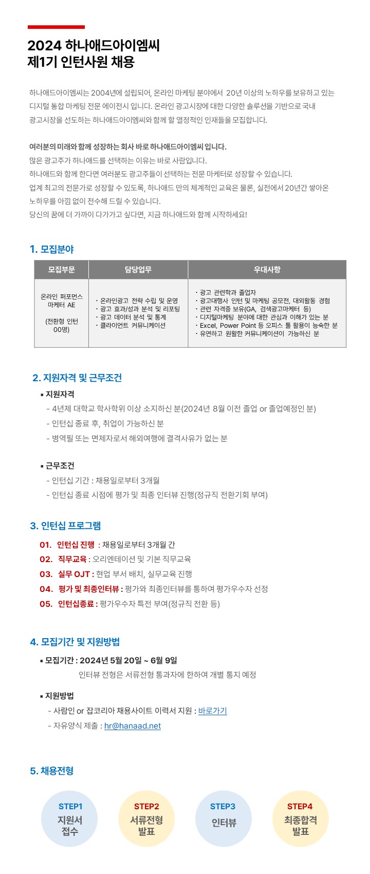 [하나애드아이엠씨] 2024년 1기 인턴사원 채용(~6/9) 글의 상세내용