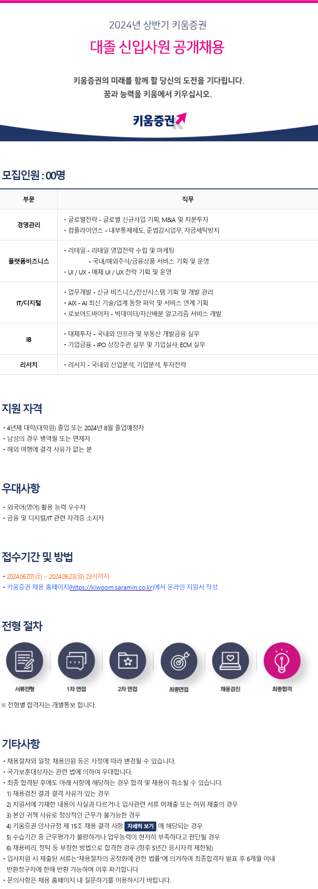 [키움증권] 2024년 상반기 대졸 신입사원 공개채용(~6/23) 글의 상세내용