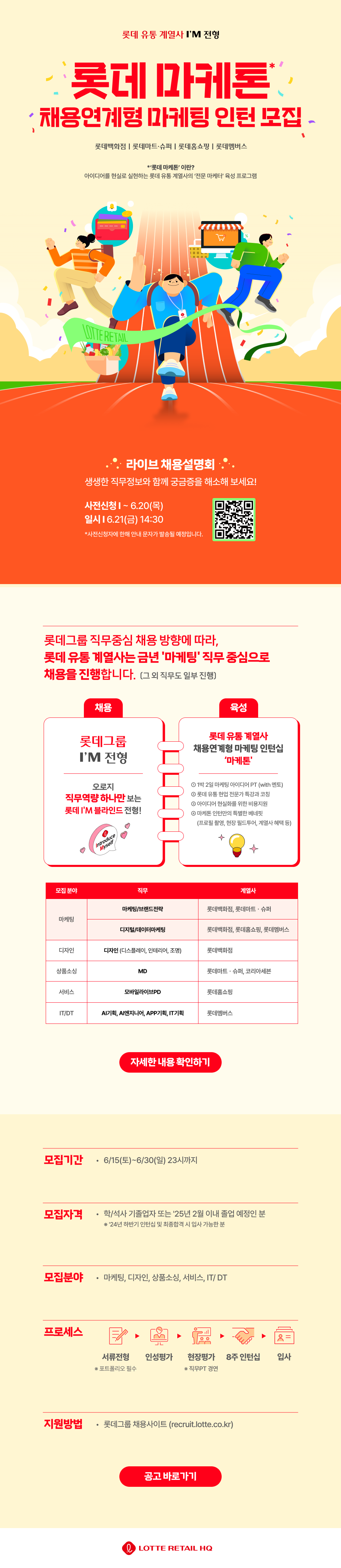 ? 6/21(금) 14:30 단 하루! 라이브 채용설명회를 통해 꿀정보?를 마구마구 드립니다✨ 많이 많이 신청해주세요 ? *신청은 6/20(목) 마감 ? 신청하기 : https://forms.gle/1YtJCexQwZrQ2urR8 롯데 유통 계열사 4곳에서 ‘롯데 마케톤’ I’M 전형을 진행합니다! *’롯데 마케톤’이란? 아이디어를 현실로 실현하는 롯데 유통 계열사의 ‘전문 마케터’ 육성 프로그램입니다. ? 채용 계열사 : 롯데백화점, 롯데마트•슈퍼, 롯데홈쇼핑, 롯데멤버스 ?