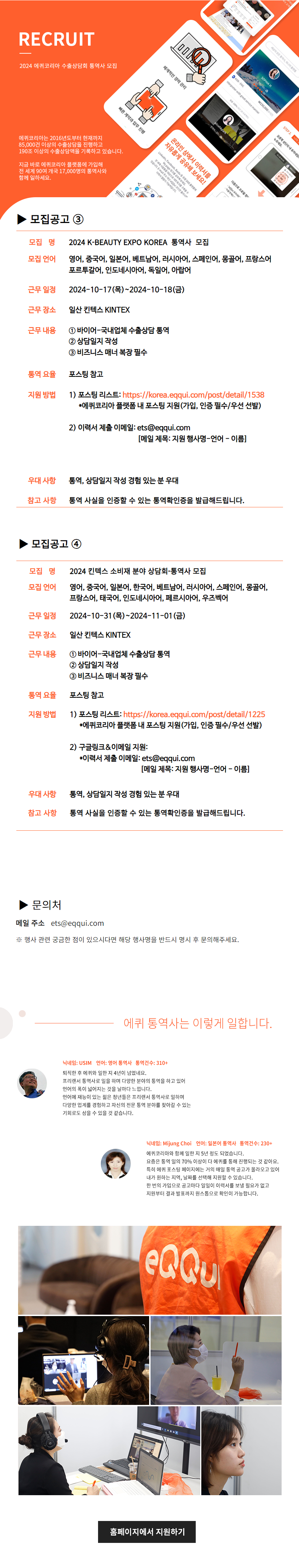포스팅 지원 2024 원주 의료기기 바이어 초청 수출상담회(GMES) 링크: https://korea.eqqui.com/post/detail/1533 H2MEET 2024연계 수출상담회 링크: https://korea.eqqui.com/post/detail/1539 2024 K-BEAUTY EXPO KOREA 수출상담회 링크: https://korea.eqqui.com/post/detail/1538 2024 킨텍스 소비재분야 상담회 링크: https://korea.eqqui.com/post/detail/1537 이메일 지원: ets@eqqui.com *이력서 미제출자 ets@eqqui.com으로 이력서 제출 [메일 제목: 지원 행사명 - 언어 – 이름]
