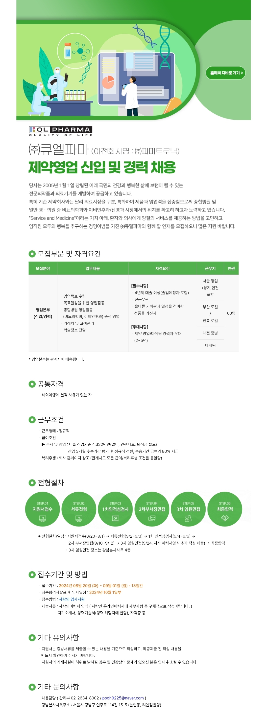 [큐엘파마] 2024년도 하반기 신입사원 정규채용(~9/1) 글의 상세내용