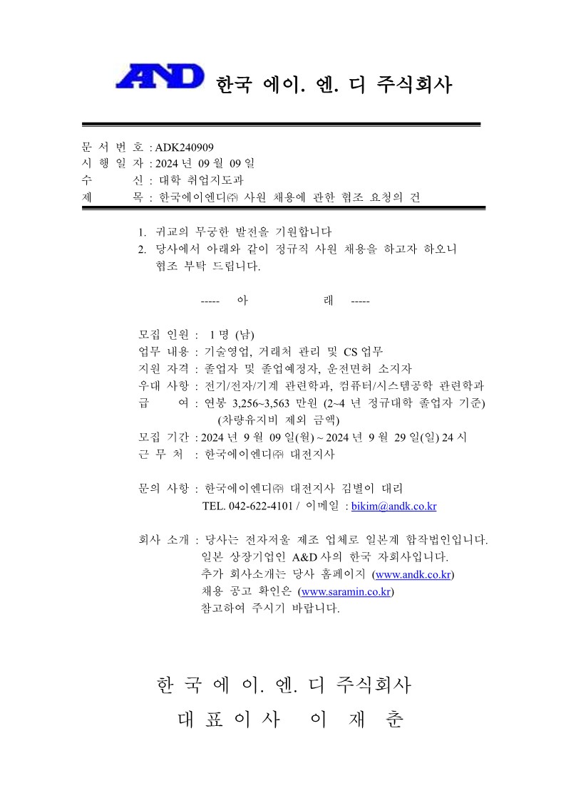 제목 [한국에이엔디(주)]사원 채용(~9/29)
