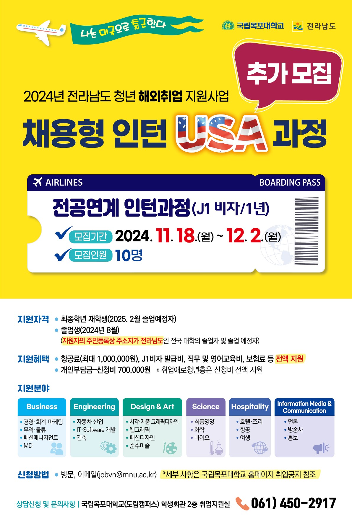 | 제목 | 「2024년 전라남도 청년 해외취업 지원사업」 채용형 인턴(미국) 과정 연수생 추가모집 | ||||